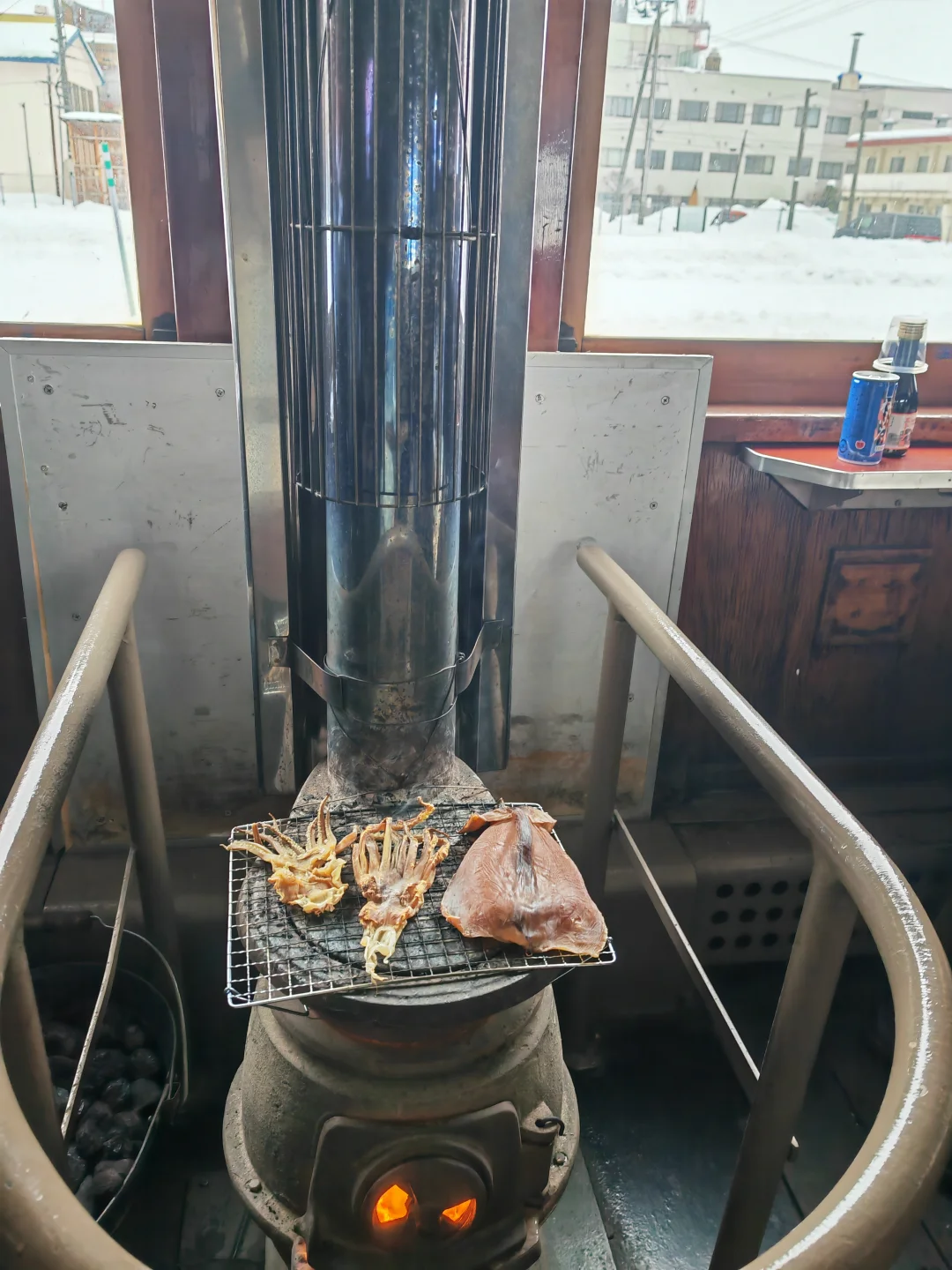 列车员会用津轻方言介绍沿途风景,售卖员则在车厢里穿梭,贩卖清酒和鱿鱼干。买下鱿鱼干后,工作人员会当场在暖炉上烤好,再撕成小片递给你,整个车厢都飘着香气。