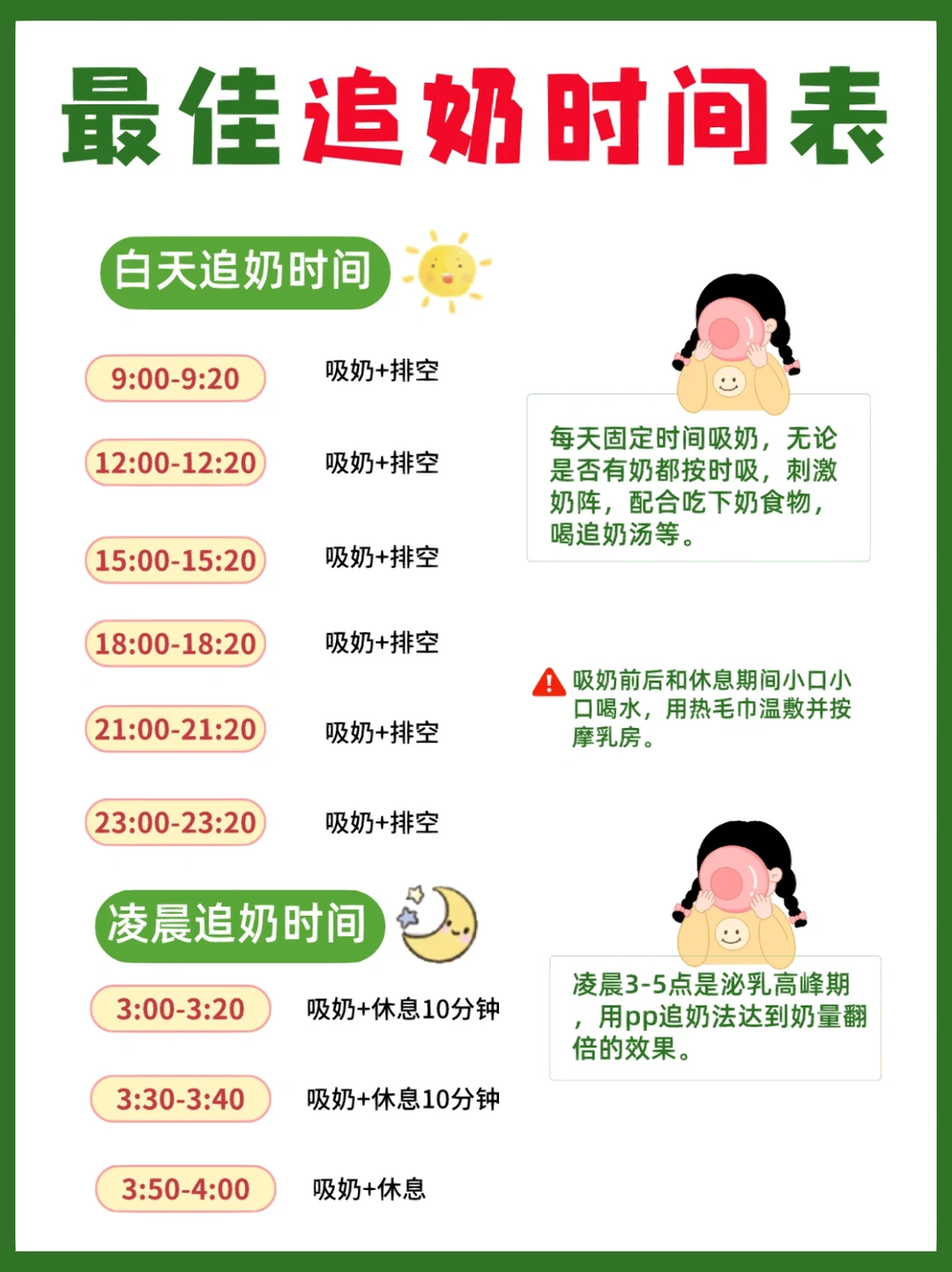 🌈然后就是把握好一天内最佳追奶时间,好好利用并提高挤奶频率,从而提高奶量。可以搭配通乳按摩操和多吃下奶食物,多按摩有助于促进母乳分泌。