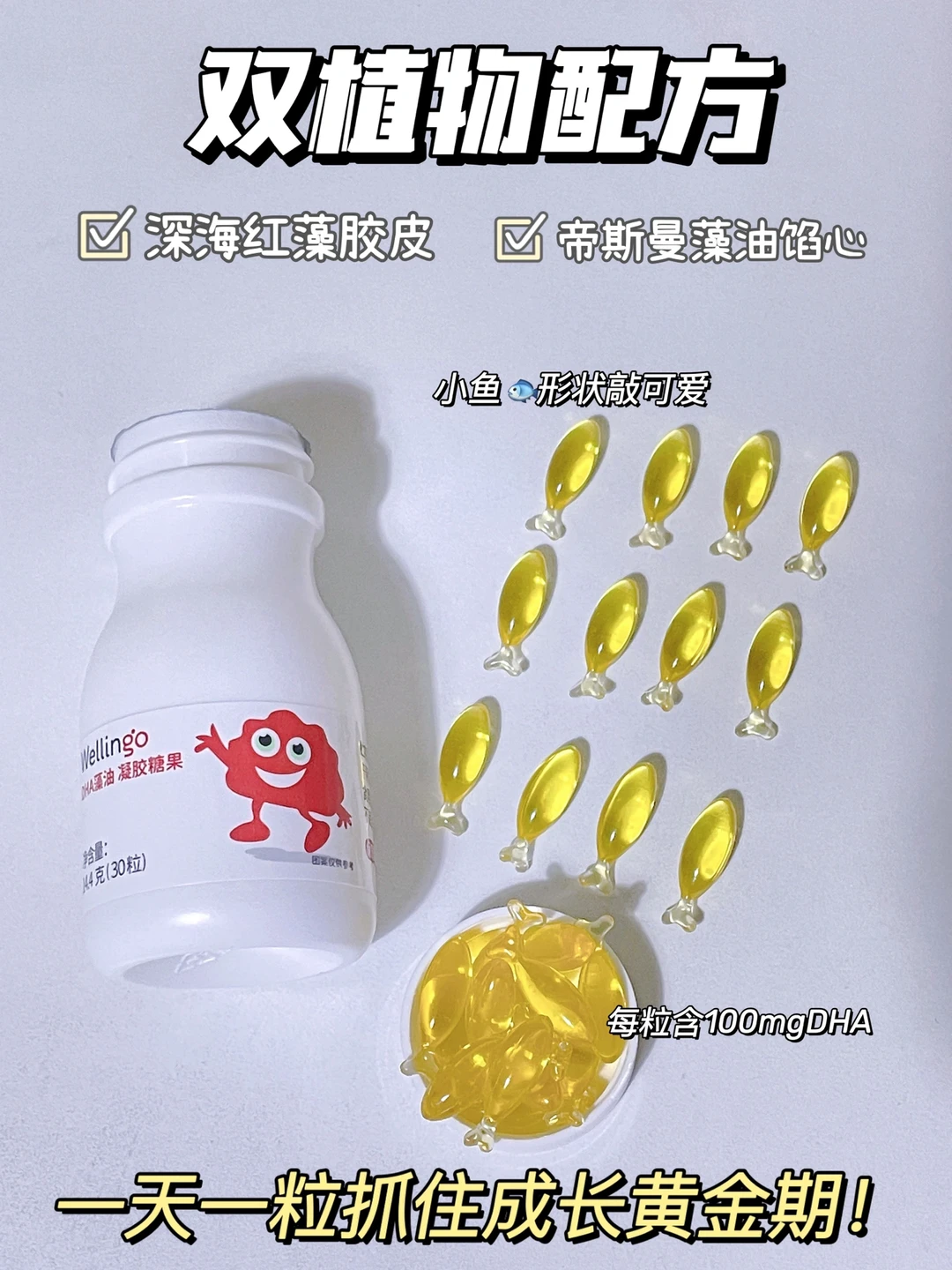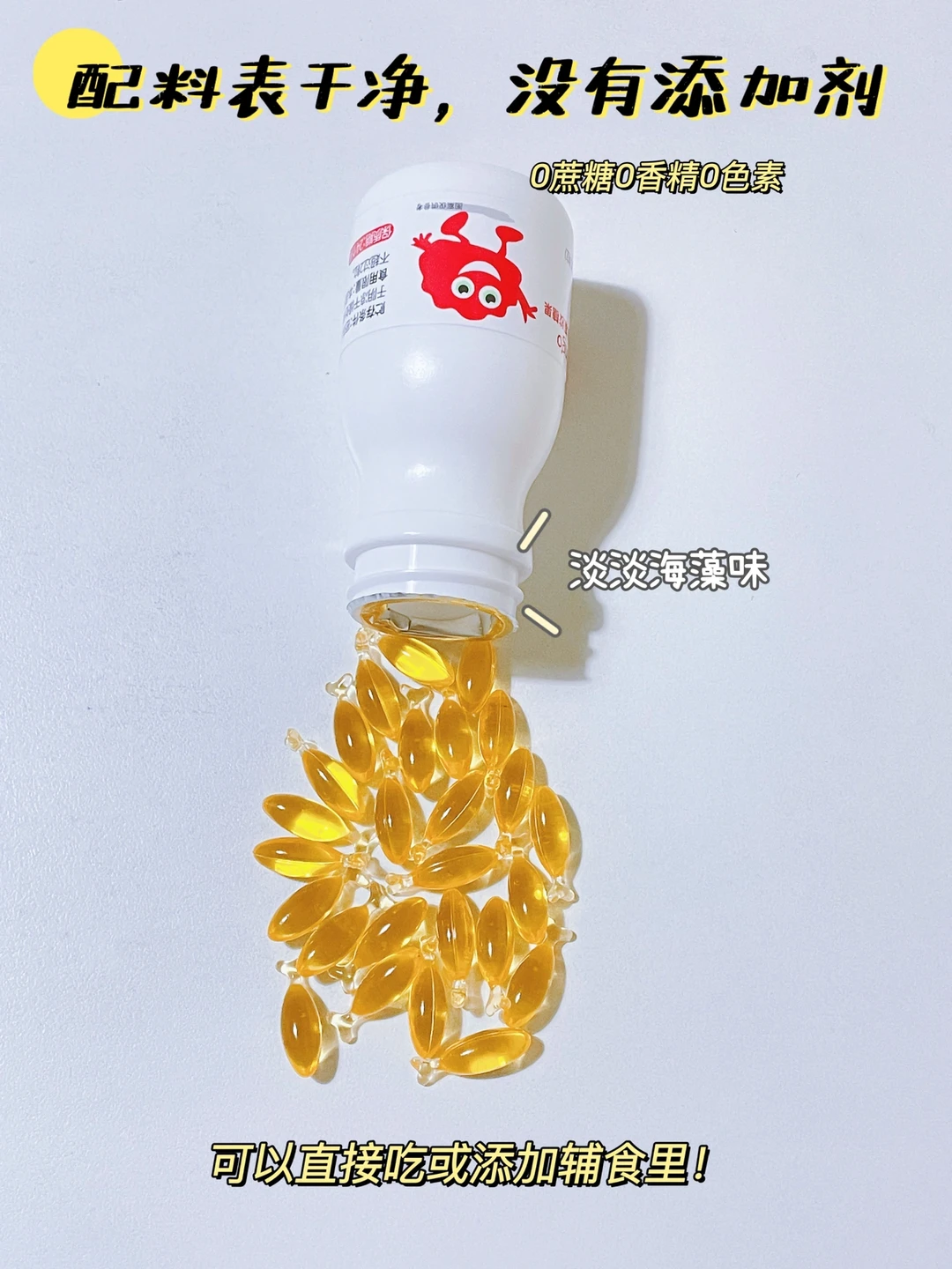 🌈我家宝宝最近一直在吃的是英氏伟灵格藻油DHA,小鱼粒胶囊装,淡淡海藻味,双植物配方,馅心只有帝斯曼藻油,外皮则是深海红藻制成的。每颗含有100mg藻油DHA,配料表干净,不添加香精、色素、防腐剂,吃着更放心,一天一颗,满足宝宝成长所需。