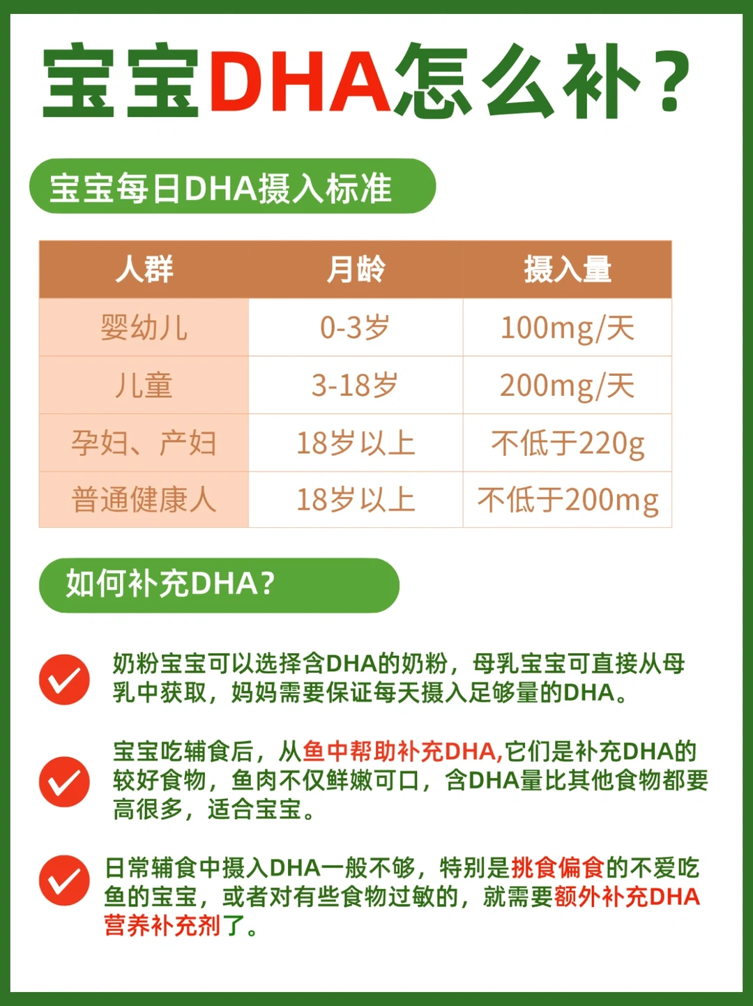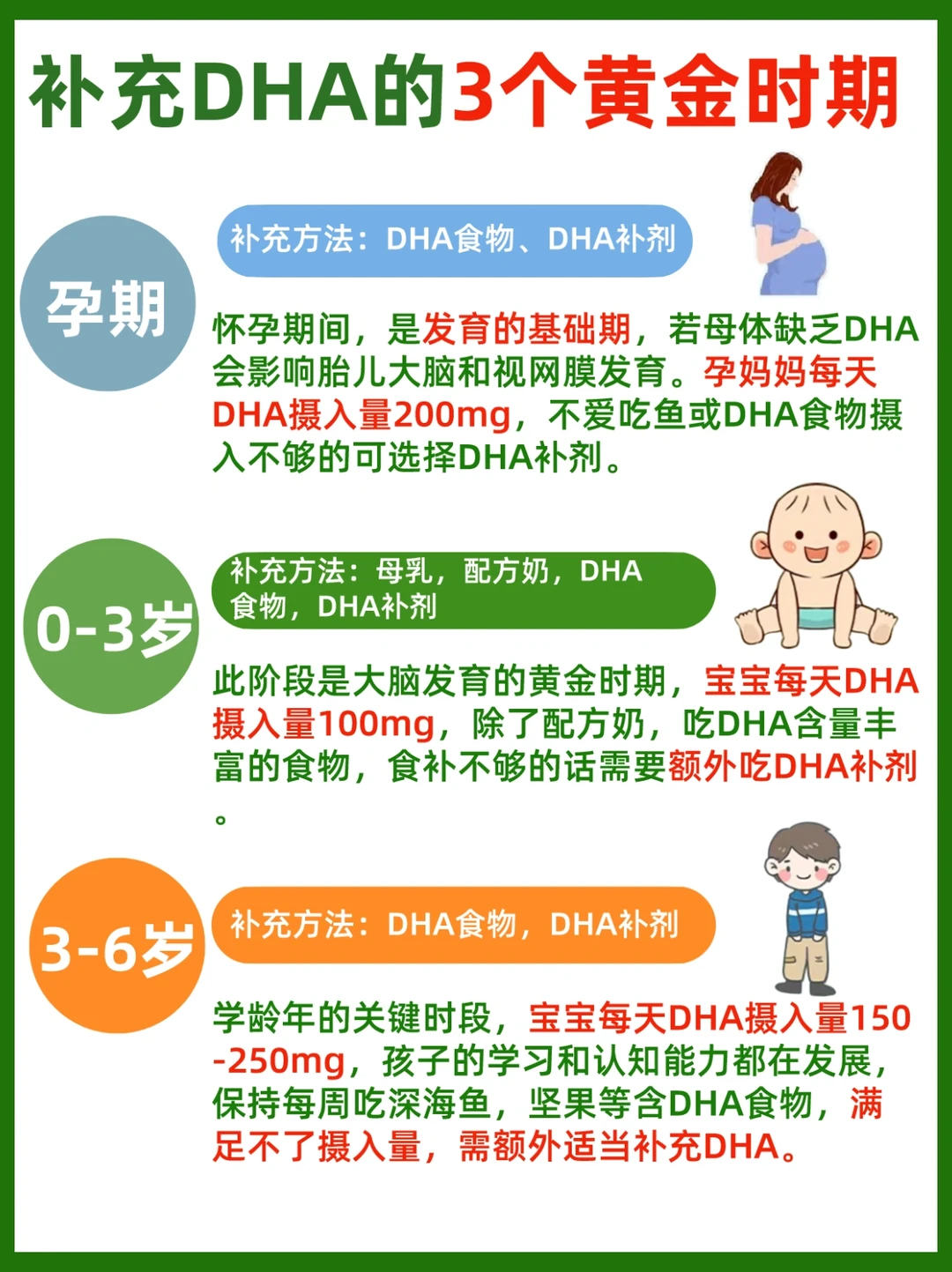 🟢0-3岁是宝宝小脑瓜成长的黄金期,这个阶段必离不开脑力营养成分DHA,宝宝每天DHA摄入量100mg,除了配方奶,吃DHA含量丰富的食物,食补不够的话需要额外吃DHA补剂。