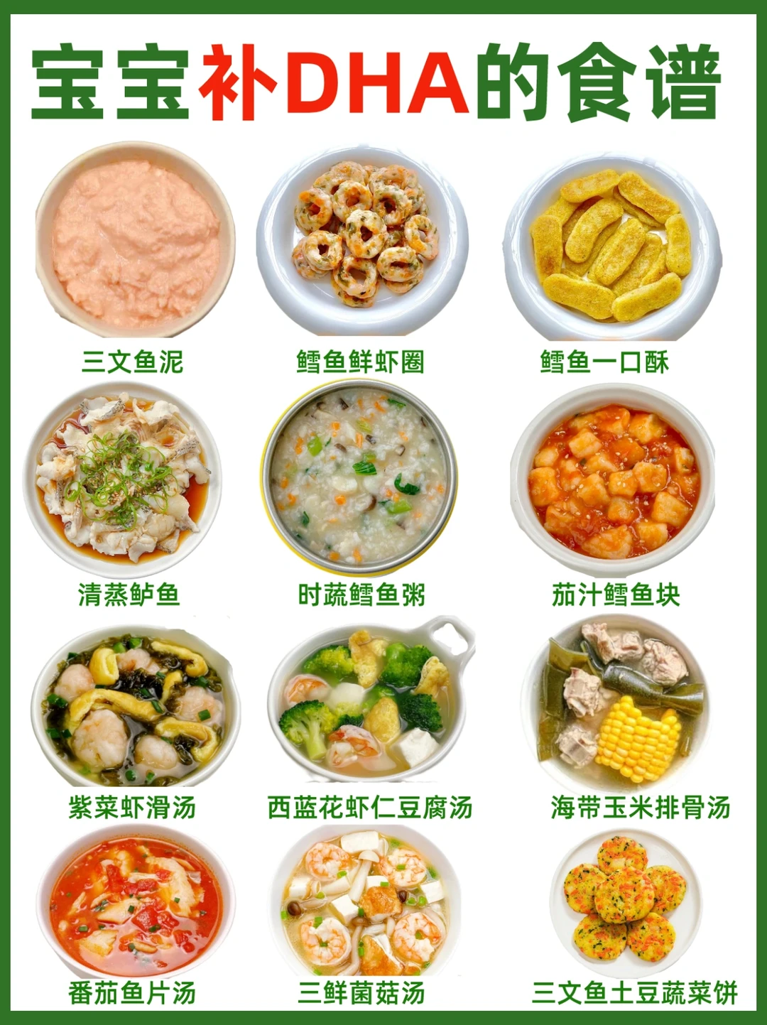 日常饮食上就需要给宝宝多吃一些 富含DHA的食物,有很多食谱家长 都可以经常做来吃的。具体补DHA的食物和食谱如图