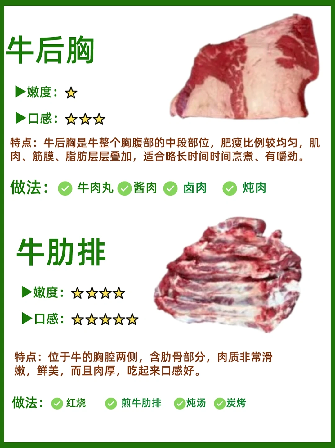 🥩胸口:牛胸肉是位于牛胸口两肢前腿中间胸脯肉,一面是脂肪,一面是红色精内,纤维粗。