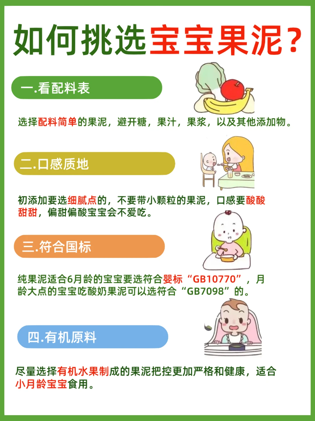 2⃣️符合国标️:纯果泥是给小月龄宝宝吃的要符合婴标GB10770,酸奶果泥给大一点的宝宝吃符合国标即可