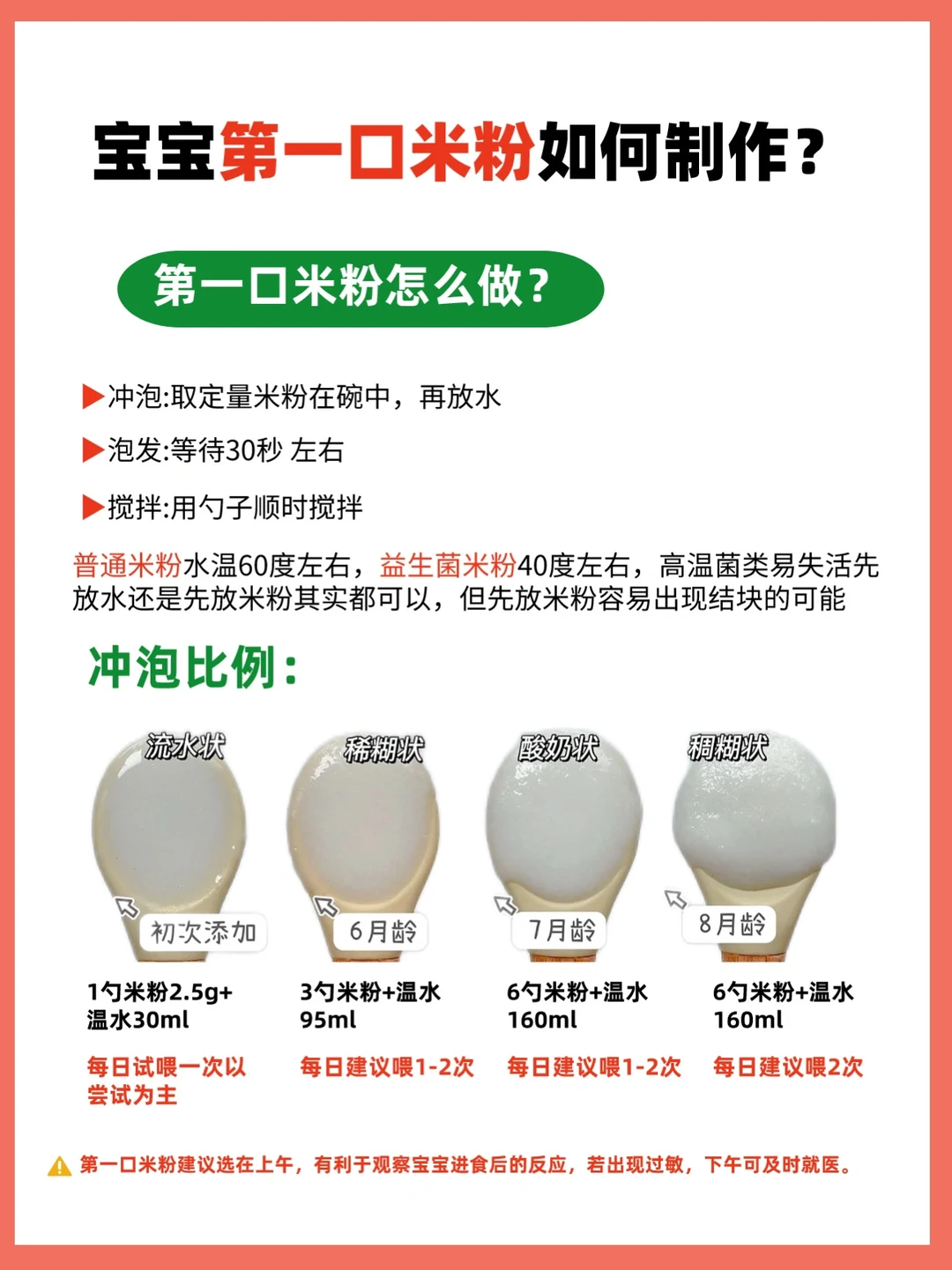 1️⃣1-8天宝宝的第一口辅食是原味高铁米粉,第一口米粉冲泡比例💕米粉2.5g:水30ml