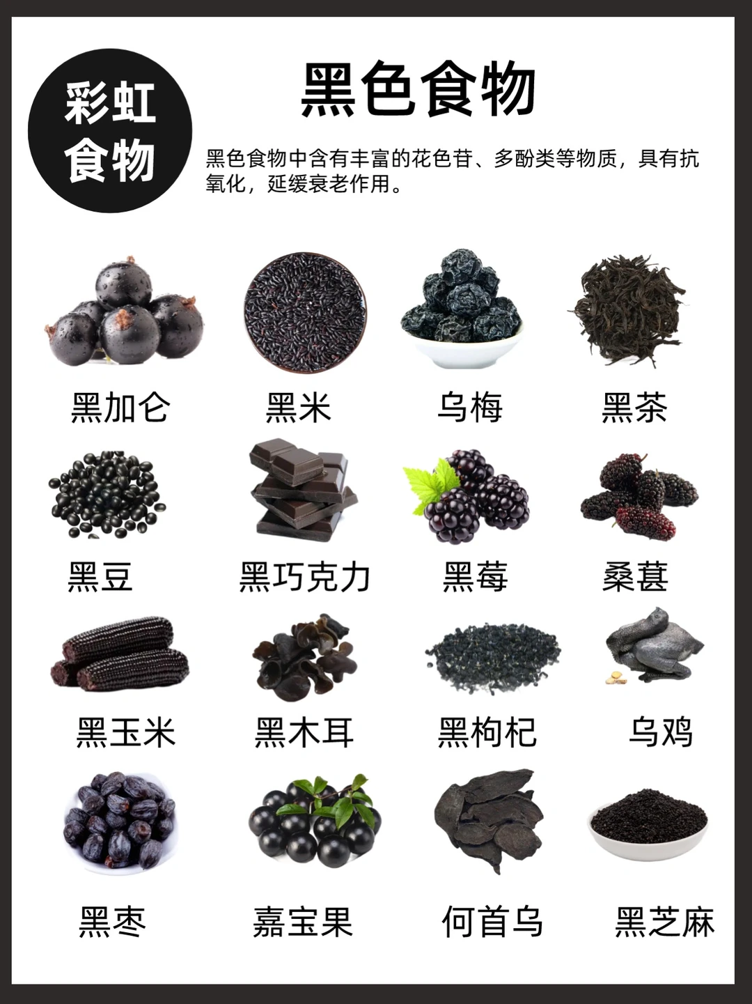 🌟常见的黑色食物:黑米、黑芝麻、黑豆、木耳、乌鸡等