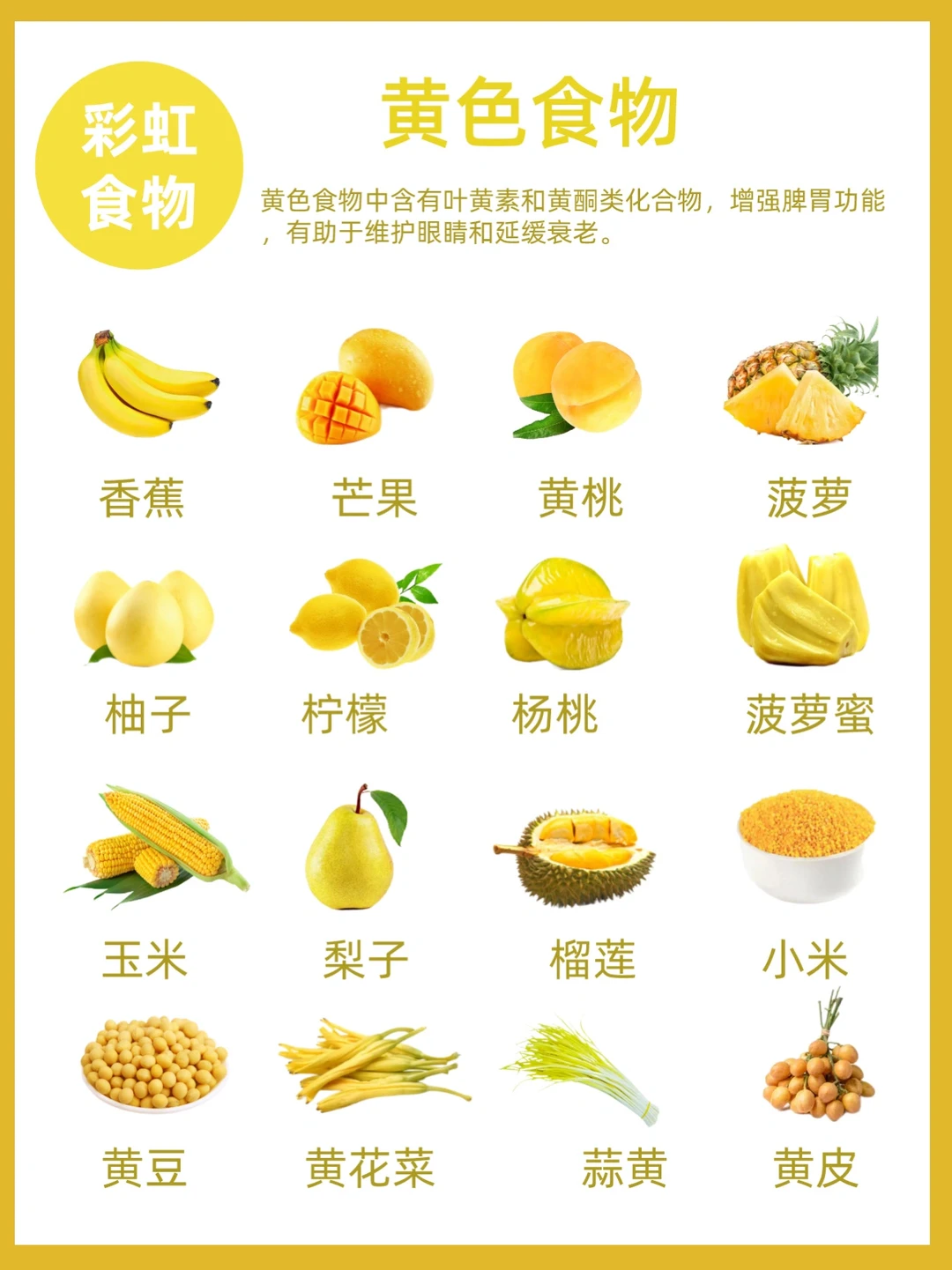 🌟常见的黄色食物:芒果、榴莲、菠萝蜜、黄桃、杨桃等。