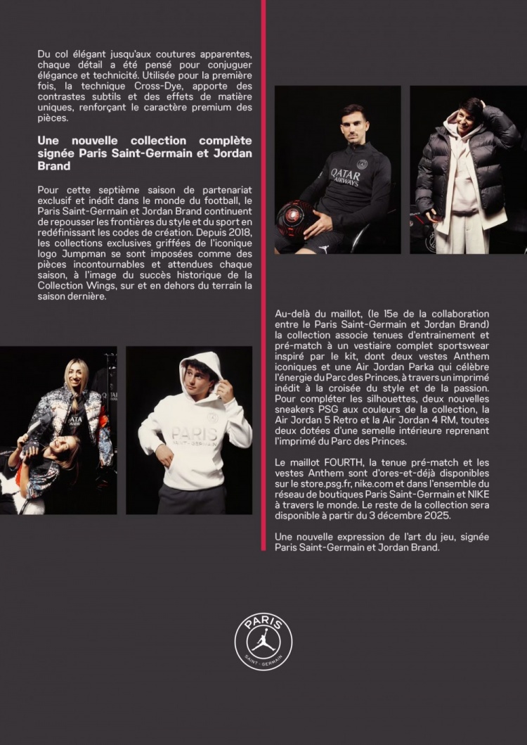 除球衣(这是巴黎与乔丹品牌合作的第15款球衣)之外,该系列还将训练服与赛前着装,同受比赛服启发的完整运动生活服饰相结合。其中包括两款标志性的Anthem夹克,以及一件以独特印花融合风格与激情、旨在颂扬王子公园球场活力的AirJordan派克大衣。为完善整体造型,系列还推出两款以该系列配色为主题的新款巴黎运动鞋:AirJordan5Retro和AirJordan4RM,二者均配备印有王子公园球场图案的鞋垫。