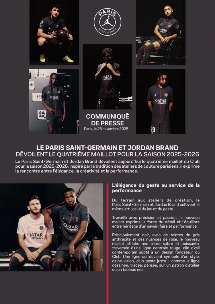 直播吧11月25日讯官方消息,巴黎与乔丹品牌于今日公布了俱乐部2025-26赛季的第四款球衣。其设计灵感源自巴黎时装工坊的传统,诠释了优雅、创意与性能的融合。