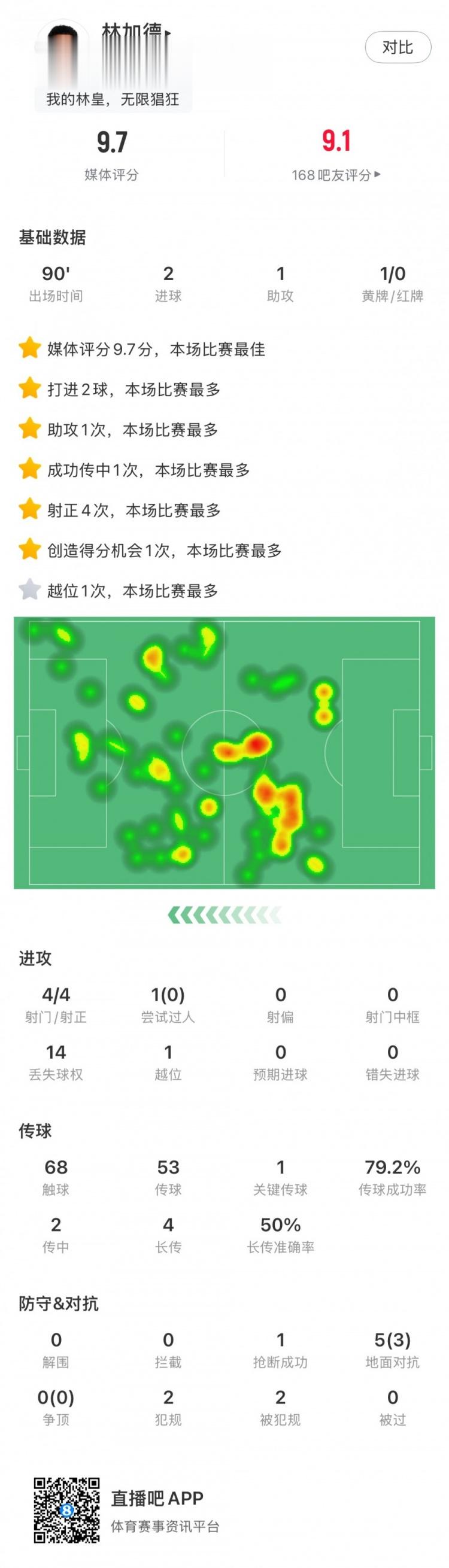 本场比赛“林皇”林加德直接参与首尔FC全部进球,贡献2射1传,赛后踢满全场的他获得了全场最高的9.7分。