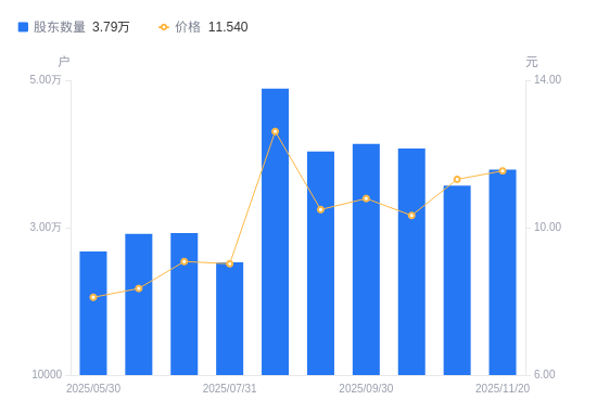 日期A股户数(户)流通A股户均持股数(股)户均持股市值(万元)2025-11-20378657089.998.182025-11-10356837523.548.512025-10-20407186593.216.812025-09-30413466493.077.012025-09-19403206658.306.982025-08-29488765492.736.932025-07-312530810607.819.572025-07-18292599175.388.332025-06-30291429212.227.692025-05-302678010024.748.13