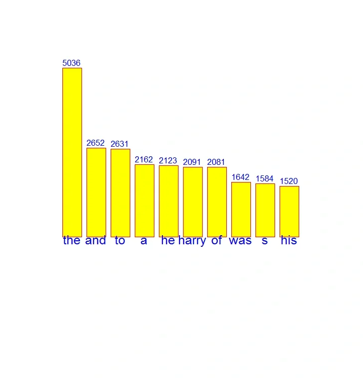 Python小项目[零R][八R] ~ [火R]要求 根据单词以及出现的频率画一个柱状图 ~ [一R]频率 heights = [5036, 2652,2631,2162,2123,2091,2081,1642,1584,1520] ~ [二R]单词 words = ['the','and','to','a','he','harry','of','was','s','his'] ~