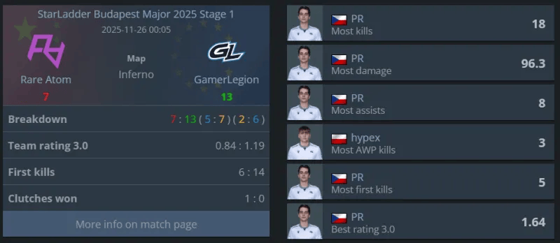 虎扑11月26日讯布达佩斯Major第一阶段瑞士轮0-2组,GL对阵RA比赛结束,GL2-0RA,差距明显!RA遗憾告别布达佩斯major