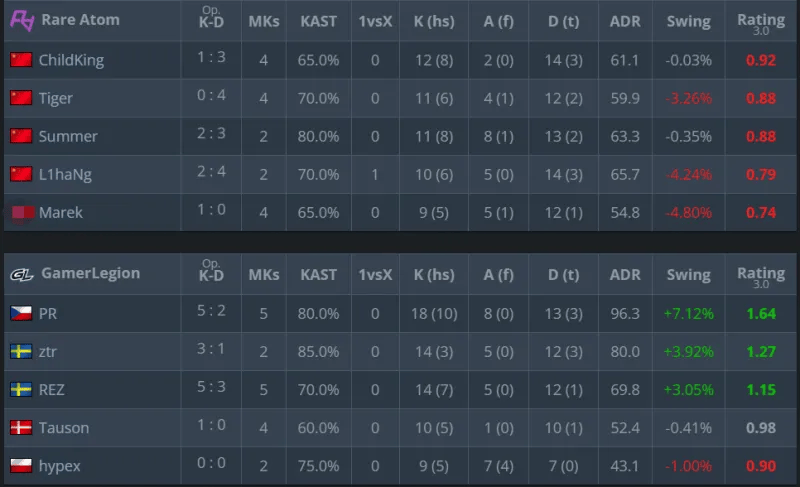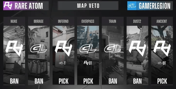 下半场易边再战,RA集合长管选择一波进攻B区,GL成功将RA攻势化解拿下手枪局。RA被迫进入经济局。经济局回来RA夺取工地拿下人数优势,RA进入B区下包,GL选择保枪,RA拿下进攻方第一分。第十六局,RA集合A区进攻再次取分。将比分缩小至11-5,GL叫出暂停。暂停回来,RA集合进攻B区不力,人数劣势情况下顽强将局面定格为1v1残局,但GL在RA下包时机取得击杀。GL率先取得赛点。赛点局GL没有再给RA机会,RA转B失败被成功防守,最终GL以13-5的比分拿下RA,RA以0-3的大比分遗憾告别布达佩斯major。