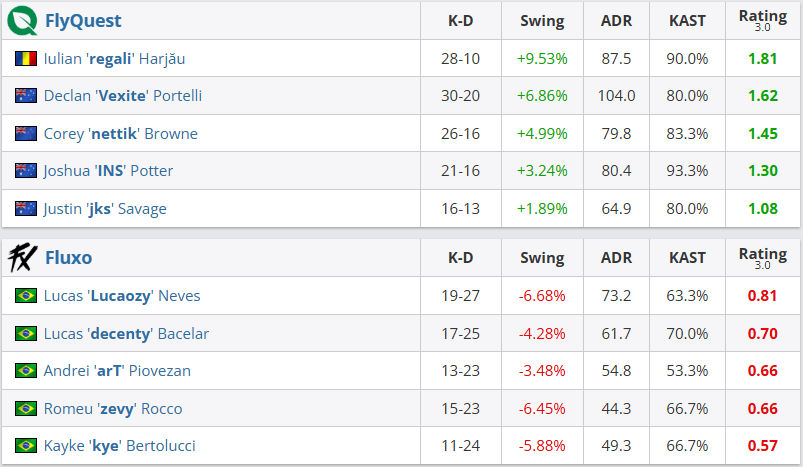 本场比赛,澳洲战队FlyQuest全员发挥、火力拉满,以26-4直落两图(Fluxo选图Overpass13-1、FQ选图Inferno13-3)的完胜,碾压横扫巴西战队Fluxo,豪取三连胜,率先昂首挺进第二阶段!
