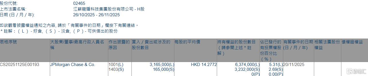 格隆汇11月26日丨根据联交所最新权益披露资料显示,2025年11月20日,龙蟠科技(02465.HK)获JPMorganChase&Co.以每股均价14.2772港元增持好仓316.5万股,涉资约4518.73万港元。