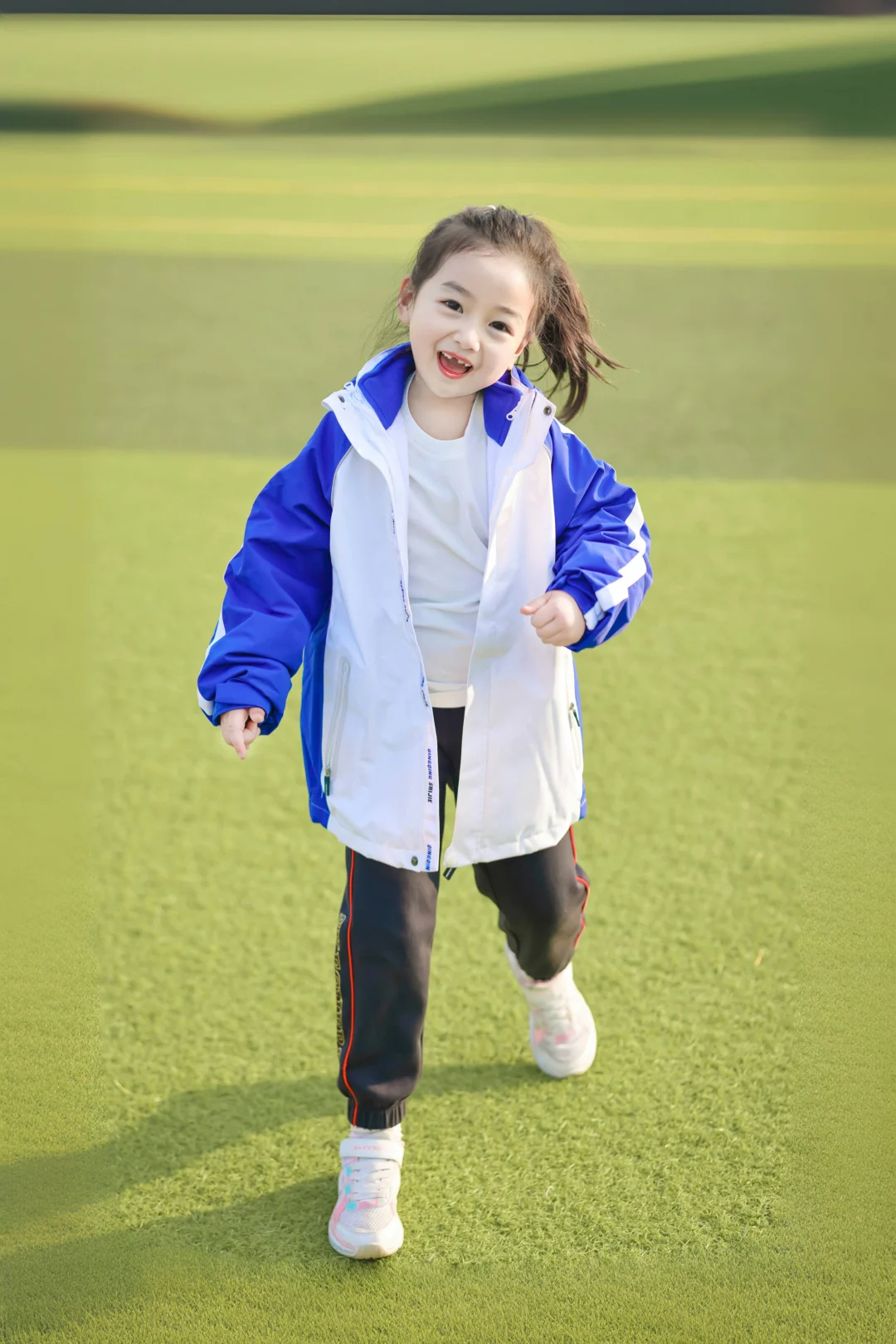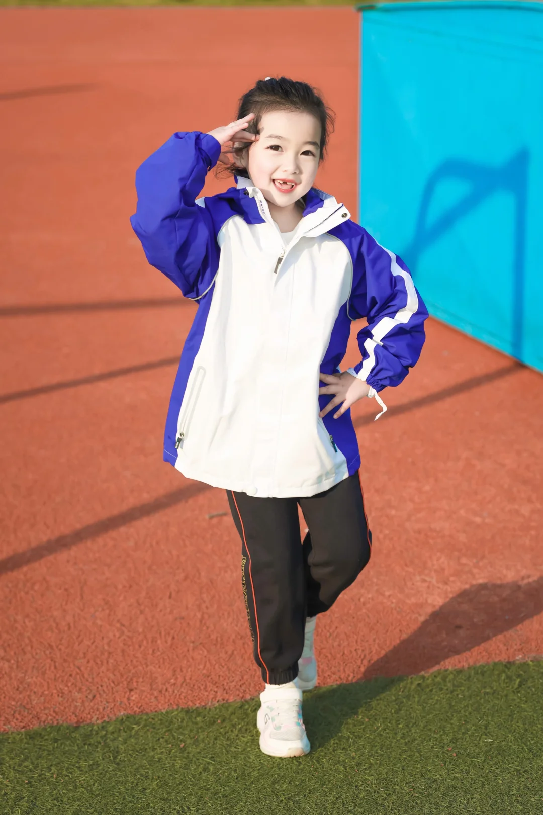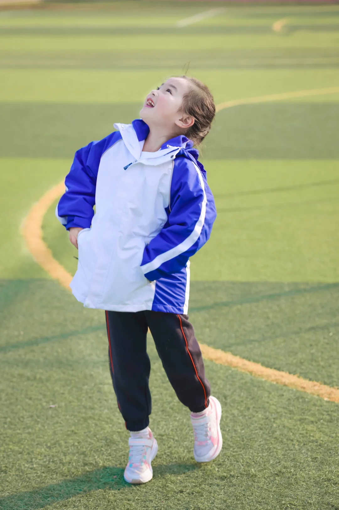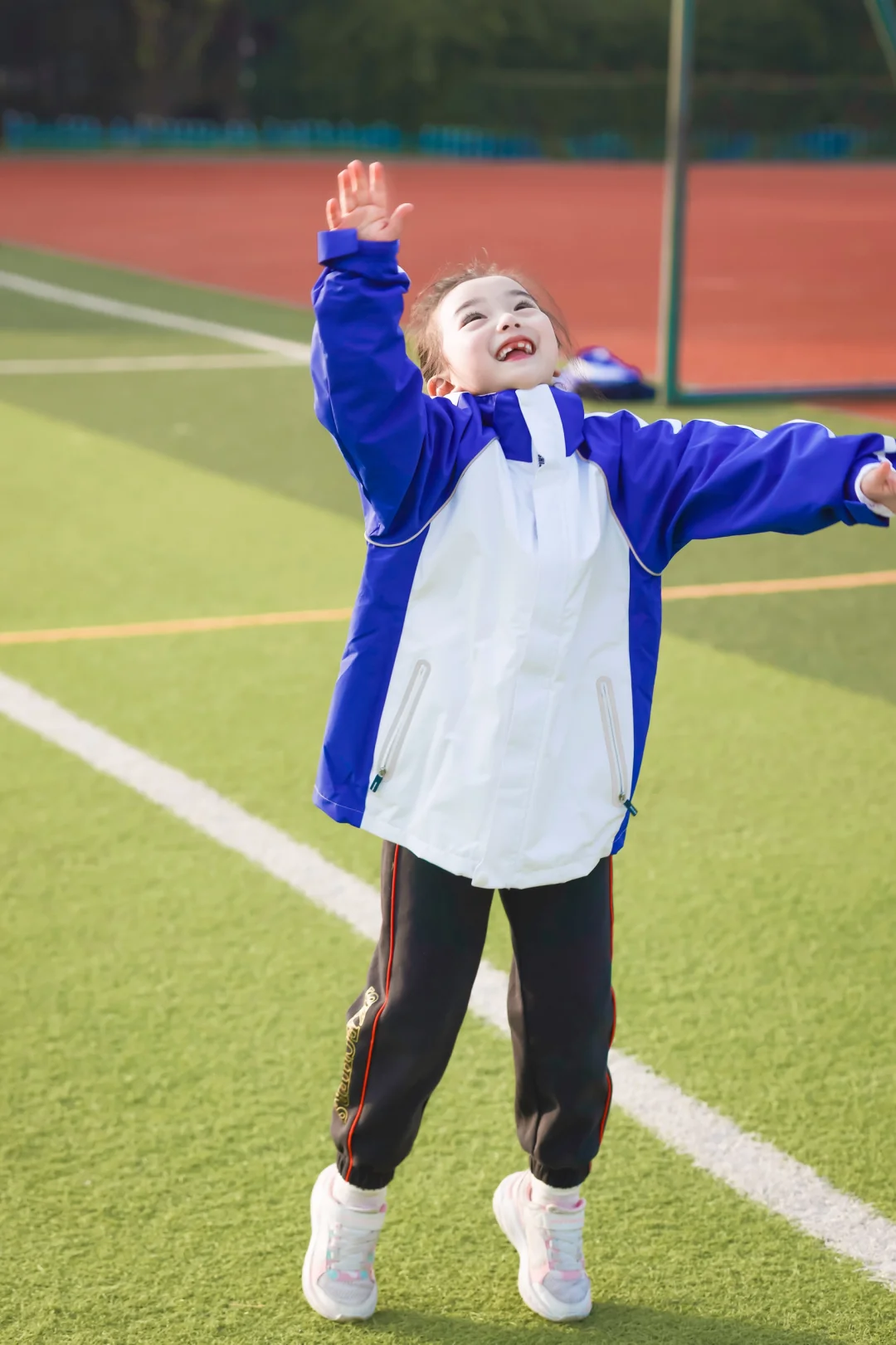 📷学校操场实拍:蓝白冲锋衣一穿,秒变活力小学妹✨防水防风的面料,深圳早晚的凉风吹不透,连帽设计超贴心——突然飘点雨?帽子一拉继续撒欢!