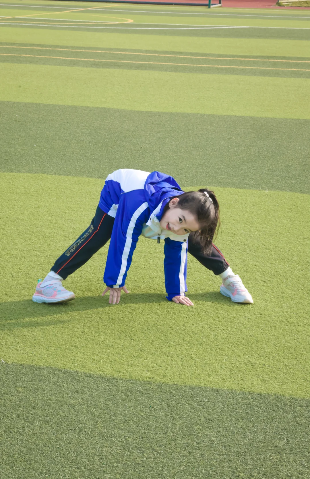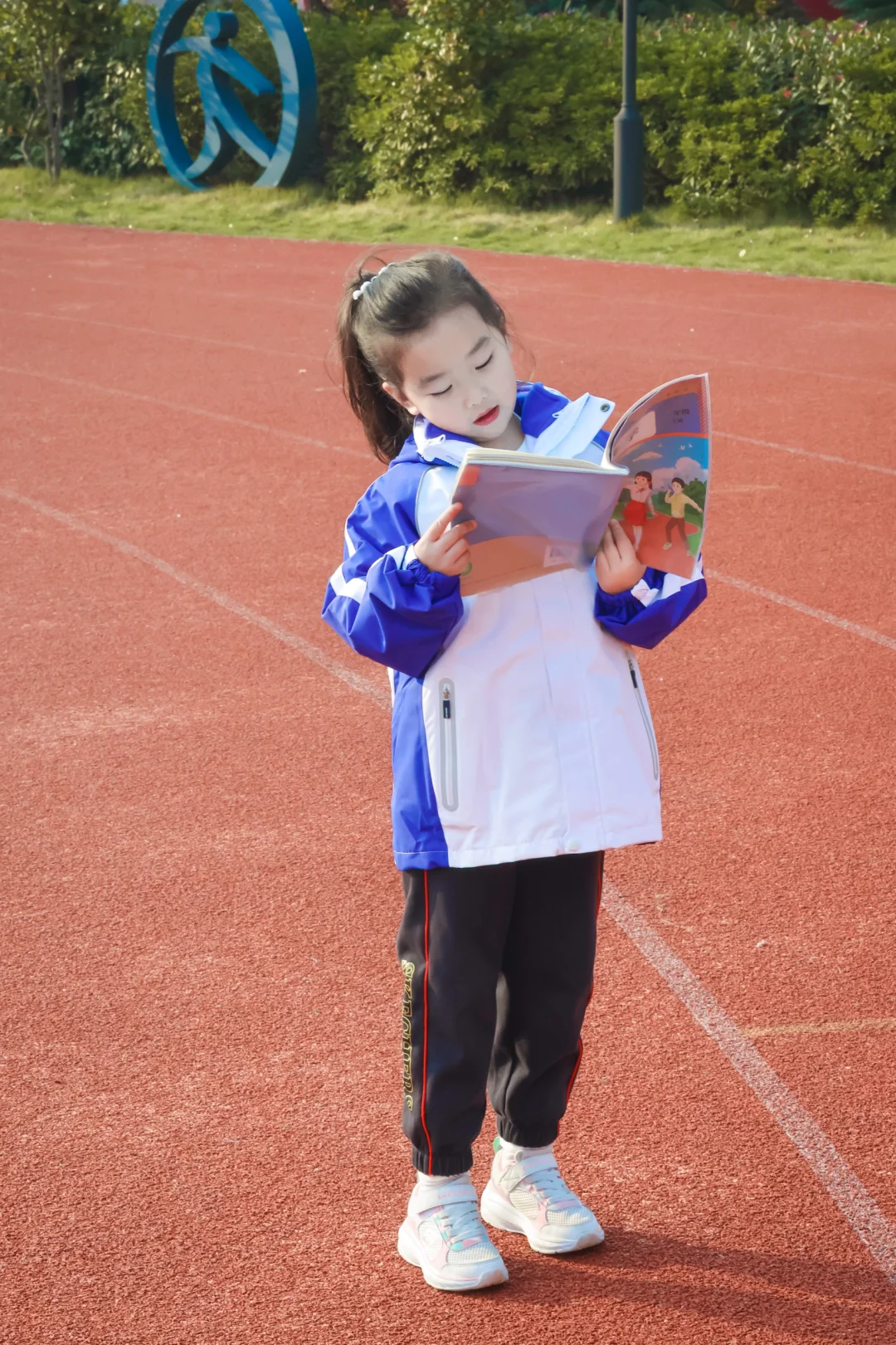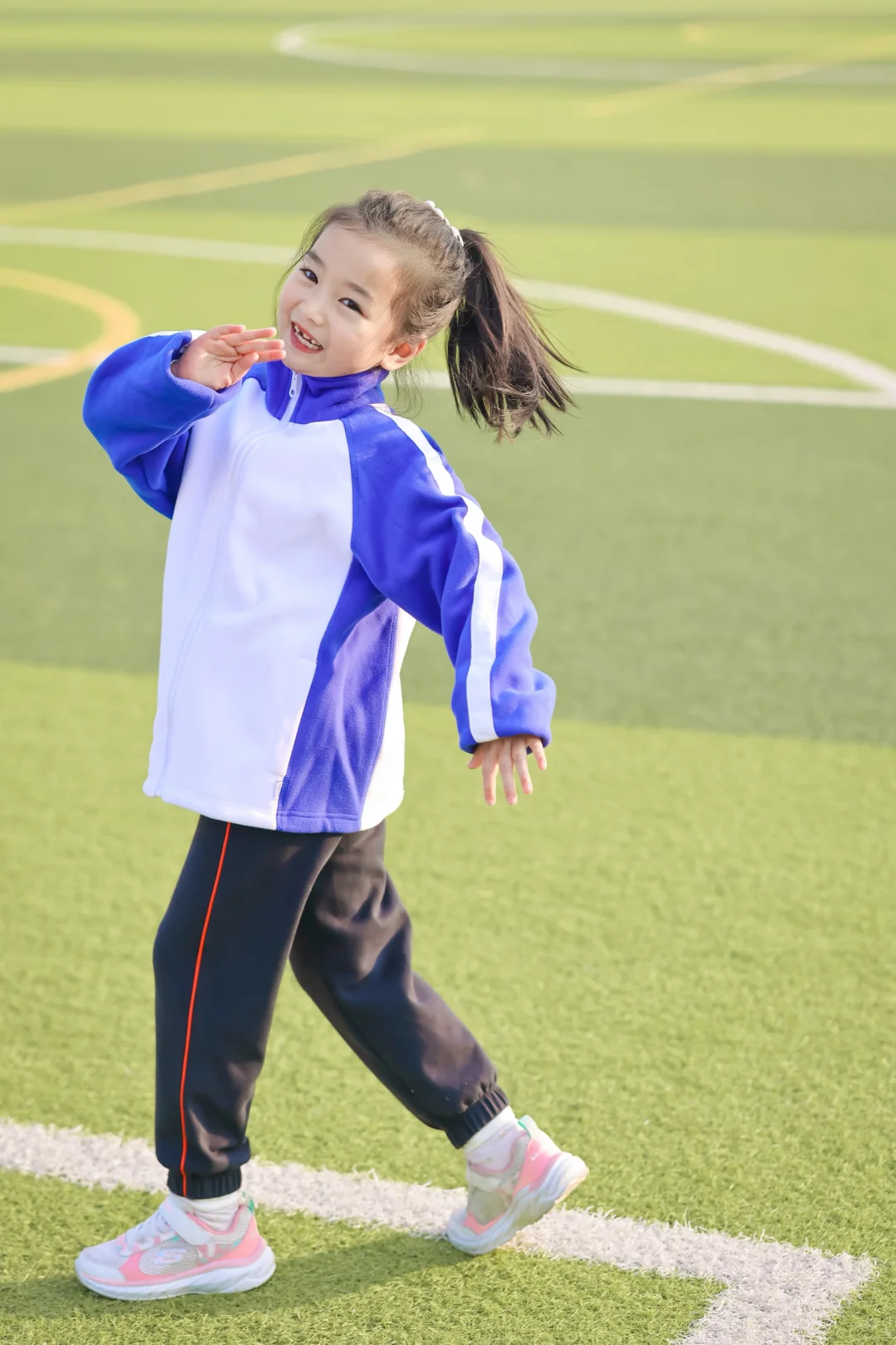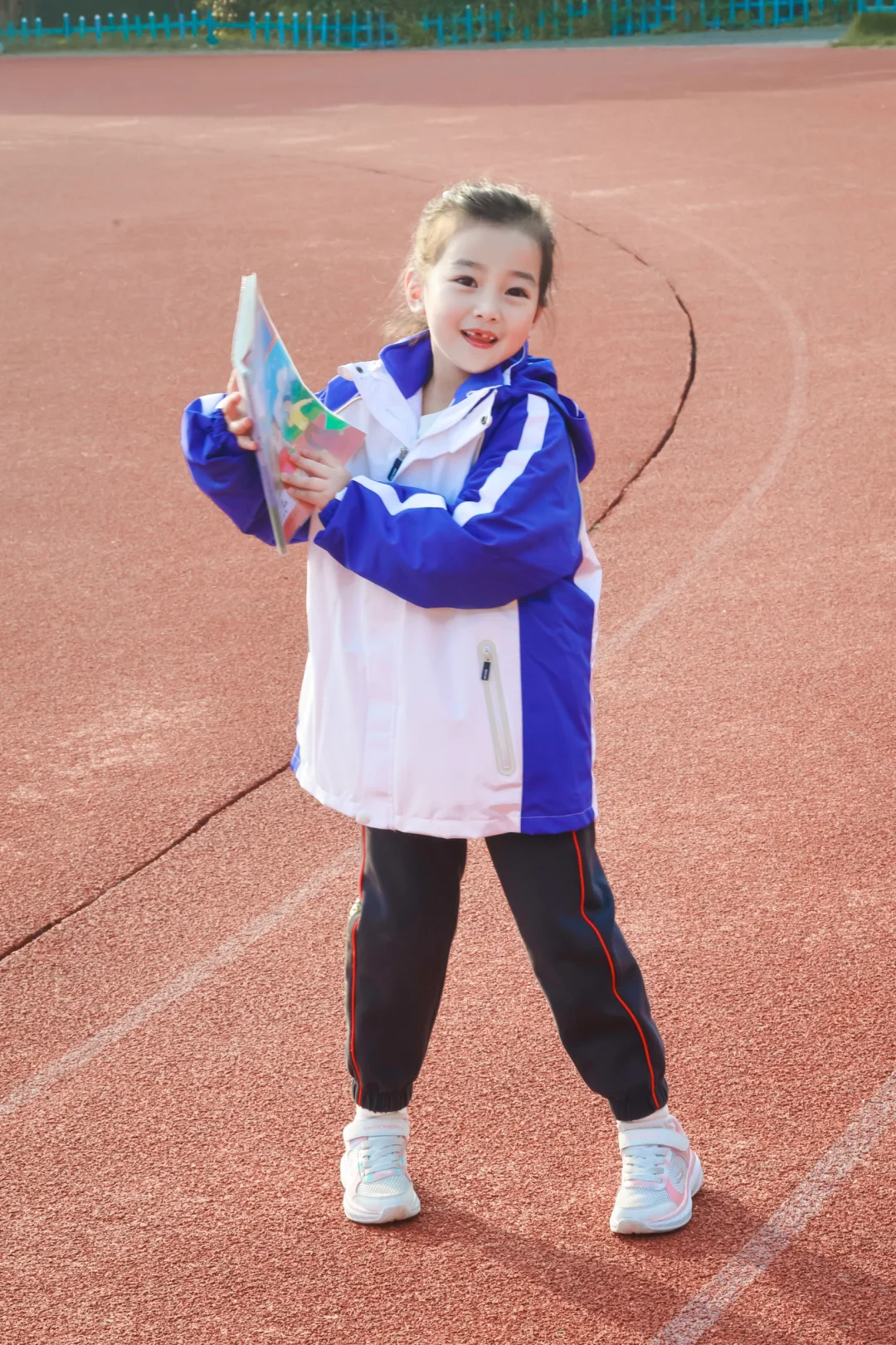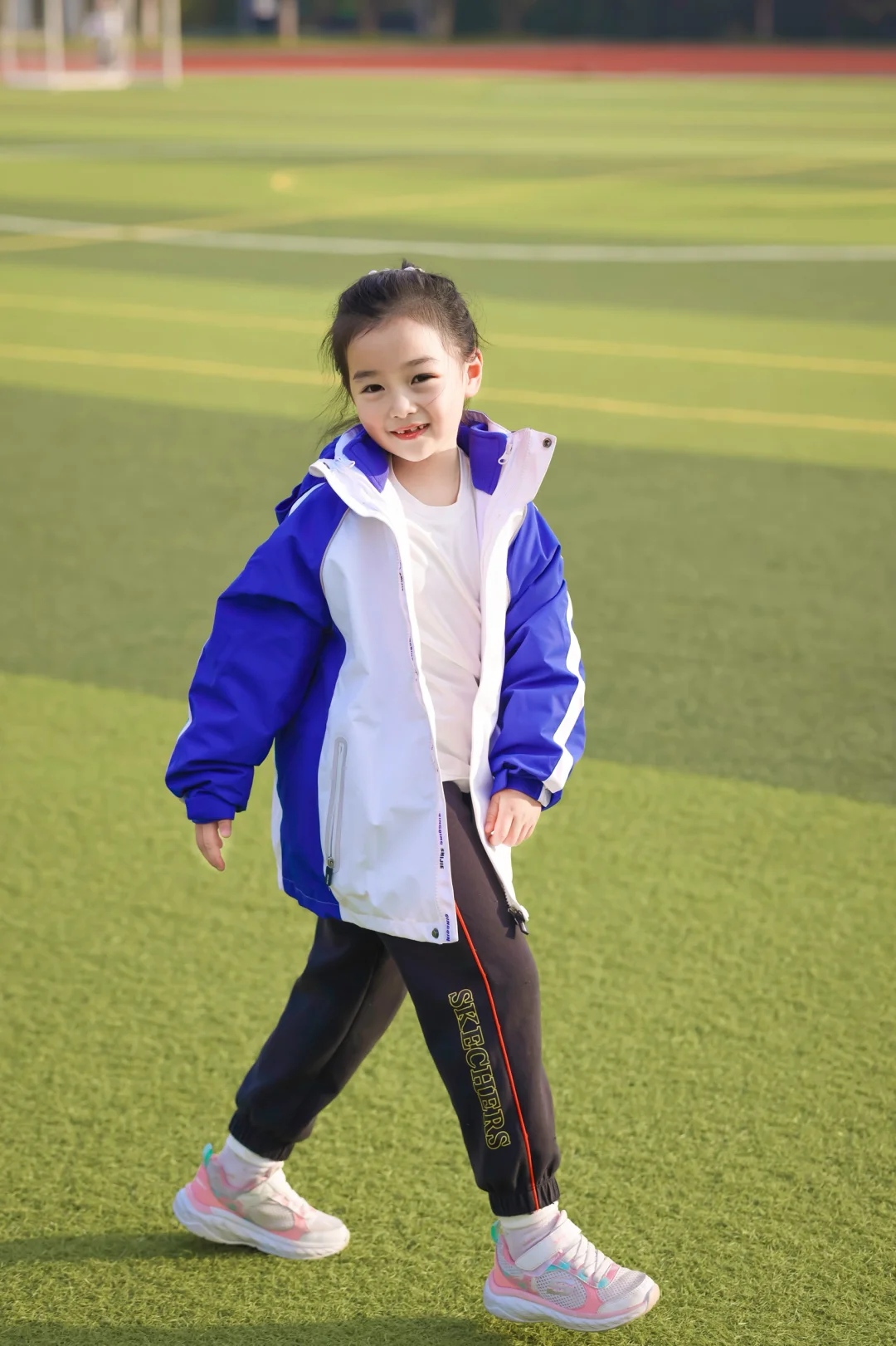 📷学校操场实拍:蓝白冲锋衣一穿,秒变活力小学妹✨防水防风的面料,深圳早晚的凉风吹不透,连帽设计超贴心——突然飘点雨?帽子一拉继续撒欢!