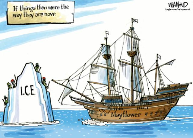 参考消息网11月26日报道“五月花”号帆船即将撞上严阵以待的ICE(美国移民和海关执法局)这座冰山。图片旁白:“如果当时的情况和现在一样”。特朗普政府今年1月执政以来奉行强硬的驱逐非法移民政策,引发广泛争议,被指动摇了立国之本。(原载美国政治漫画网)