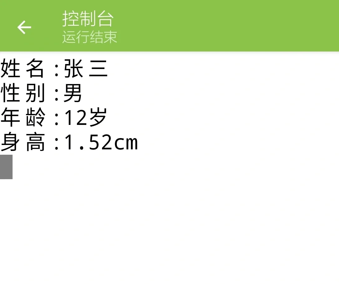 ~ ⭐️题目: 在程序中定义变量,分别存储学生张三的姓名,性别(男),年龄(12),身高(1.52),并在控制台打印输出。 ~ 🌟输出效果如下: 姓名:张三 性别:男 年龄:12岁 身高:1.52cm ~