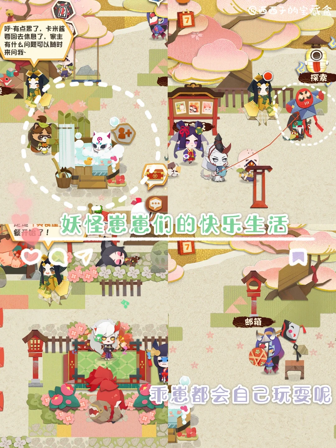 🎀游戏玩法也变的很少女,居然是种田和养成属性的,需要我们照顾这些可爱的小妖怪们,负责他们的生活起居,建设和布置自己的庭院,了解不同小妖怪的喜怒哀乐,管理庭院中的大小事务等……