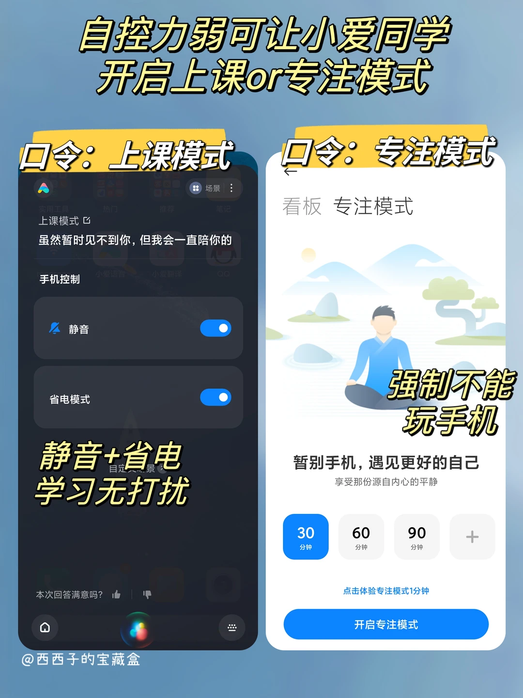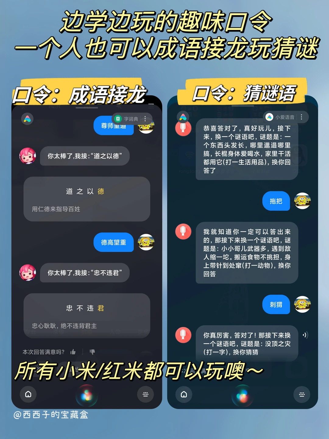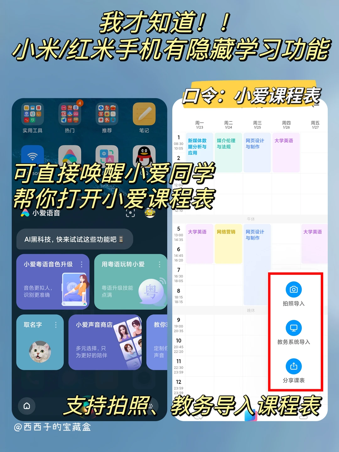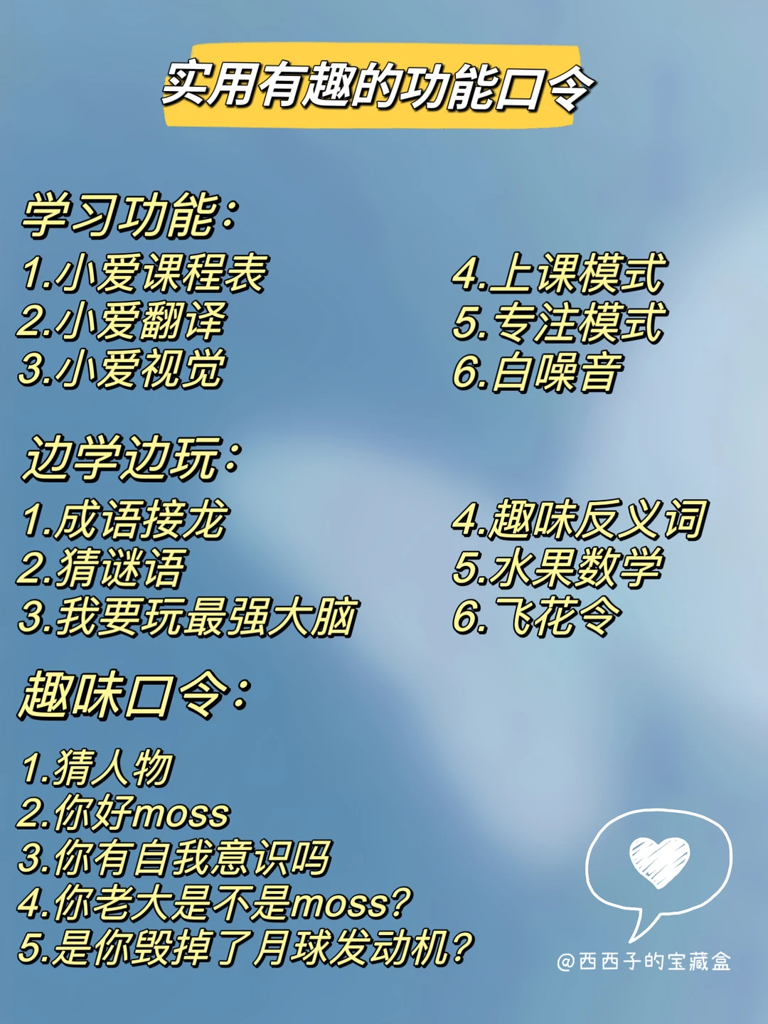 [合十R]大数据啊!请把这篇推给在用小米/红米手机的姐妹们吧~ [举手R]手持小米,却不知道小米小爱同学隐藏的学习功能,那可就太亏啦! [打卡R]这篇就来盘点小爱同学的隐藏实用学习功能口令,及流浪🌍趣味对话口令! [种草R]学生党尽情🐎住嘤!!~ · ✅实用学习功能口令 1.小爱课程表 小爱会帮你打开手机课程表,可以通过拍照、教wu等方式导入课程表,导入后,只要问小爱就能知道当日的课程啦! · 2.小爱翻译 上外语课、追剧听不懂的时候呼叫小爱打开翻译,可以直接开启同声传译和屏幕翻译噢,还能识别英语口音、导出翻译内容! · 3.小爱视觉 帮你打开手机扫一扫功能,支持识文字、提取表格、提取PPT、扫描转PDF格式、拍照翻译等多个功能噢 · 4.上课模式 帮你的手机开启静音、省电模式、及关闭小爱唤醒,一呼就让手机变安静,给你一个更专注的学习空间! · 5.专注模式 自控力弱的同学可以让小爱帮你打开专注模式,适用写作业or需要专注的时候,开启后就不能玩手机了噢· 6.白噪音 上百种免费的白噪音可听,需要学习专注或睡前放松,可以直接对小爱帮你播放噢!贴心小棉袄嘿嘿~ · ✅趣味边学边玩口令 成语接龙 猜谜语 我要玩醉强大脑 趣味反义词 水果数学 飞花令 · ✅趣味口令关键词 猜人物-(让小爱来猜你内心喜欢的明星,我笃定小爱能猜中hhh~) 你好moss 你有自我意识吗 你老大是不是莫斯 是你毁掉了月球发动机 · [私信R]就是说! 小米是什么时候开始背着我偷偷变这么香的呢? [私信R]一个小爱同学就能搞定多个功能!又省内存又实用,还免费!