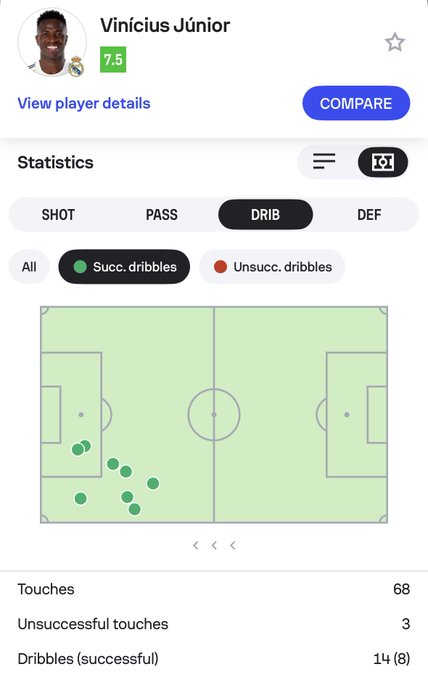 维尼修斯本场8次成功过人,追平其欧冠生涯单场最高纪录