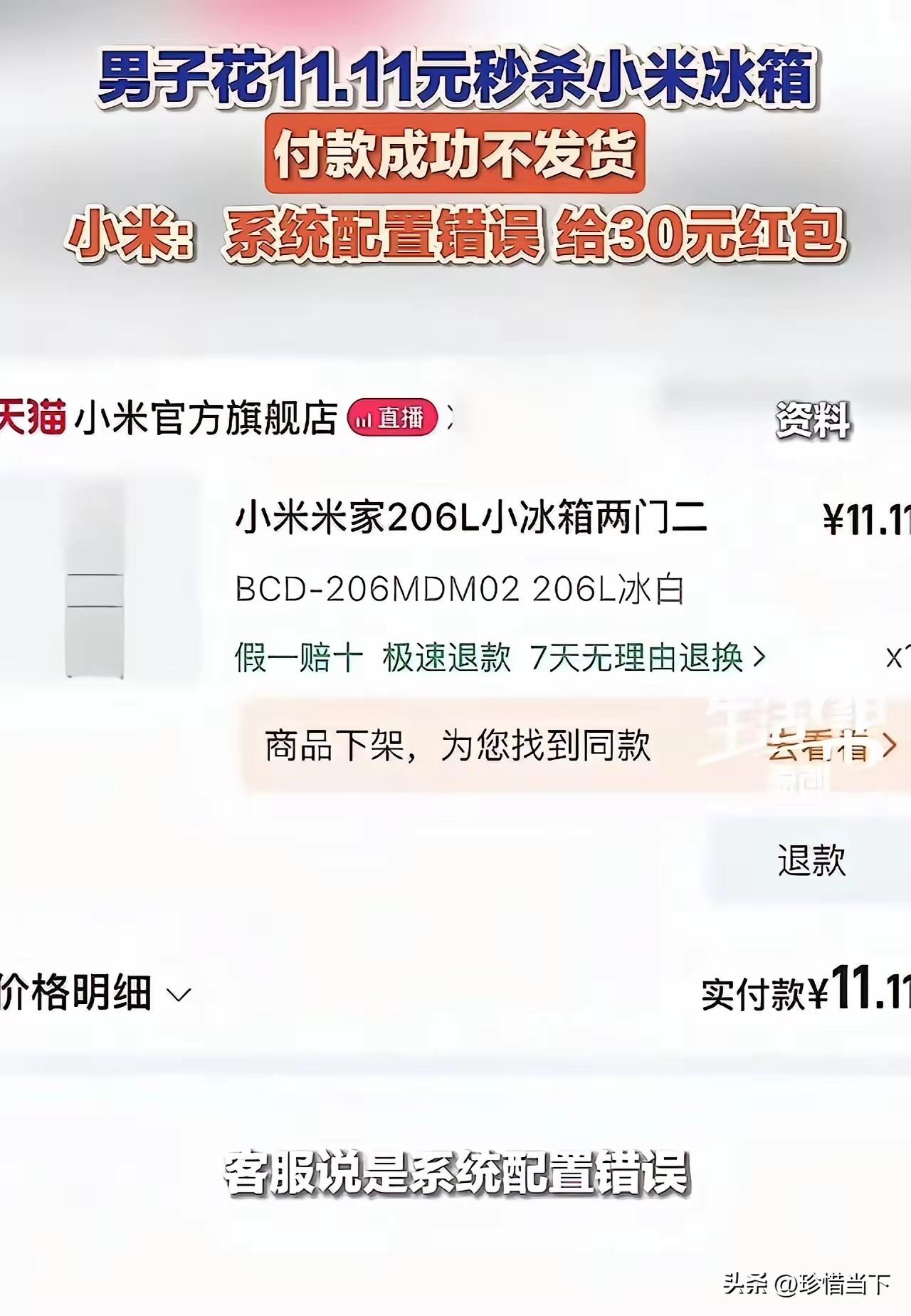 11.11元秒杀小米冰箱被拒发,30元红包想了事?网友怒了:大企业的契约精神值多