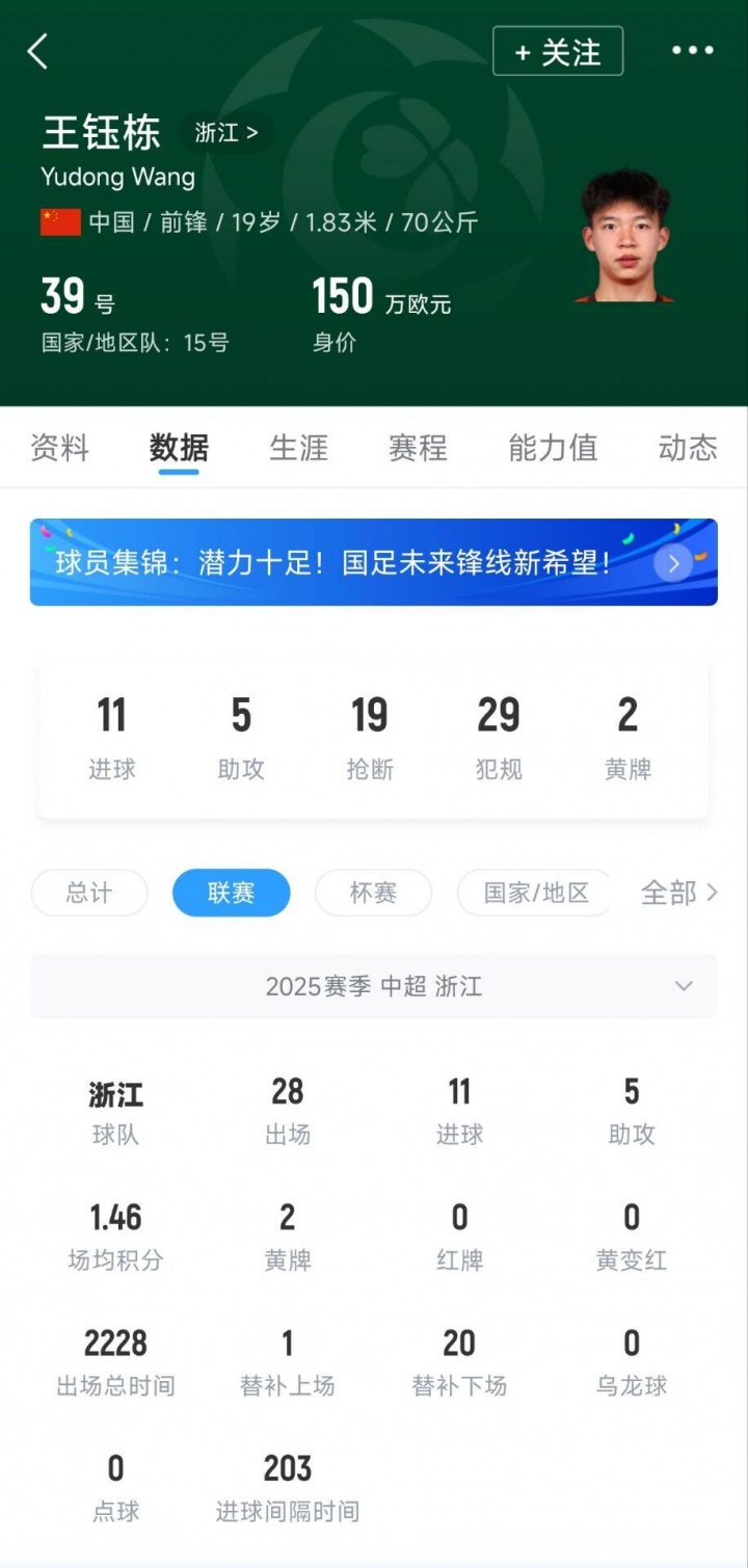 直播吧2025赛季中超最佳年轻球员,浙江队的前锋王钰栋毫无悬念地当选。这名刚满19岁的中国队国脚,本赛季为浙江出战28场中超比赛,收获11球5助,拿下中超本土射手王。