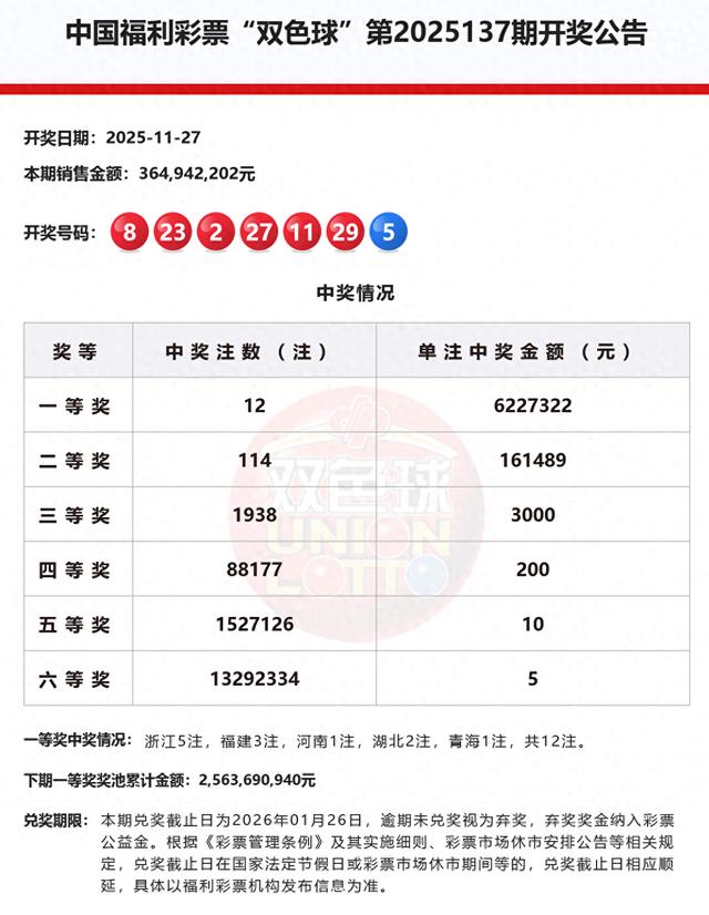 大皖新闻讯中国福利彩票“双色球”第2025137期中奖号码:红球:2、8、11、23、27、29;蓝球:5。
