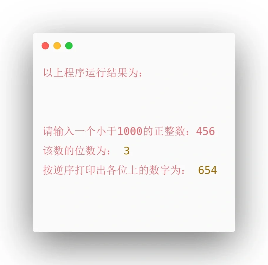 Python小项目[一R][一R][六R] ~ [一R]要求 给出一个小于1000的正整数,编程求该数是几位数,并按逆序打印出各位上的数字。 例如:原数为456,则输出为654。 ~ [六R]程序分析 程序使用num = num // 10的方法来计算num是几位数,因为每整除10一次就会少一位数,然后每次循环取出数的最后一位并添加到反向数中。本题还可使用字符串的逆序输出该功能,先将num转换成字符串,然后将字符串逆序输出,最后再将逆序的字符串转换为整型。 ~