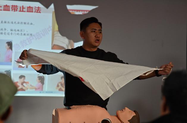 培训把实练环节作为重中之重,在刘老师指导下,学员们轮流上场,借助模拟人等专业设备,反复练习心肺复苏、创伤救护等技术要点,做到“手把手”教学、“实打实”操练、“一对一”过关。为帮助大家掌握胸外按压的黄金频率,老师别出心裁地引入大众熟知旋律作为节拍器,这种创新方法大大提升了学习效率和趣味性,现场气氛十分热烈。