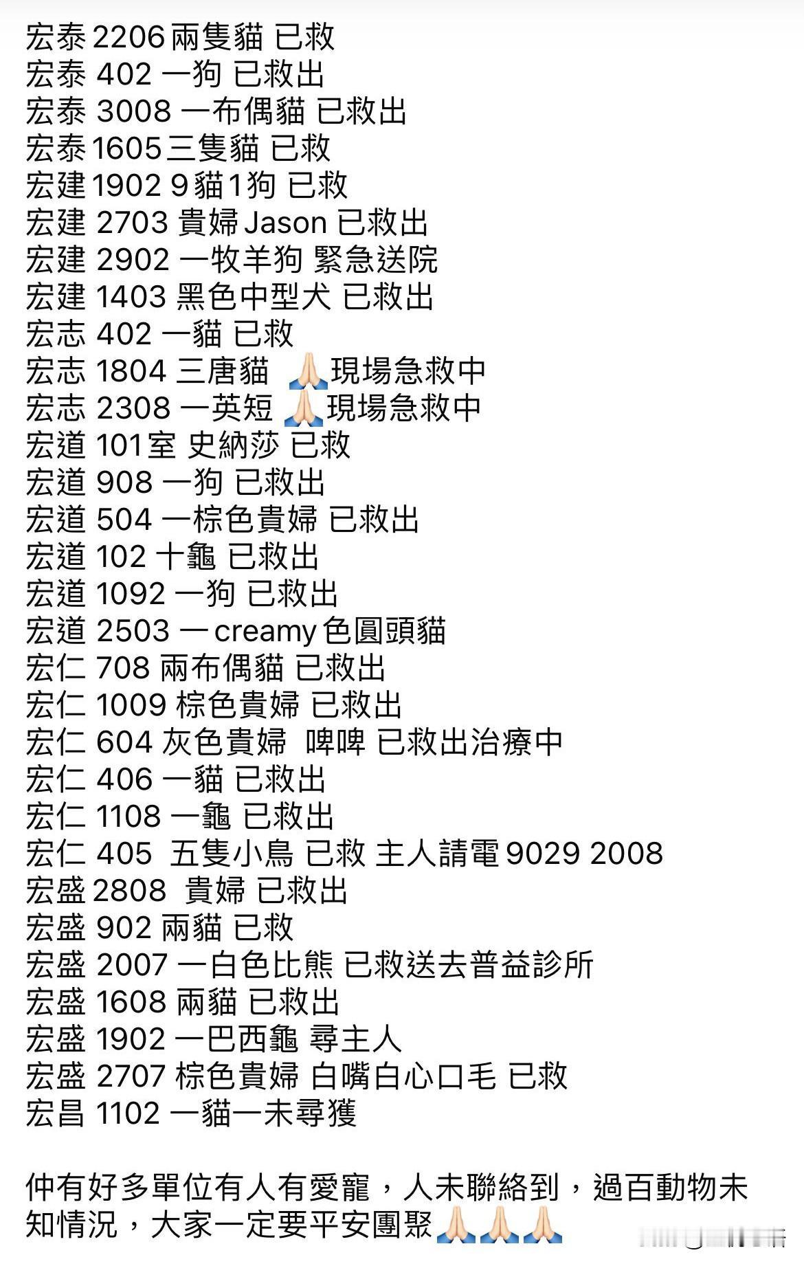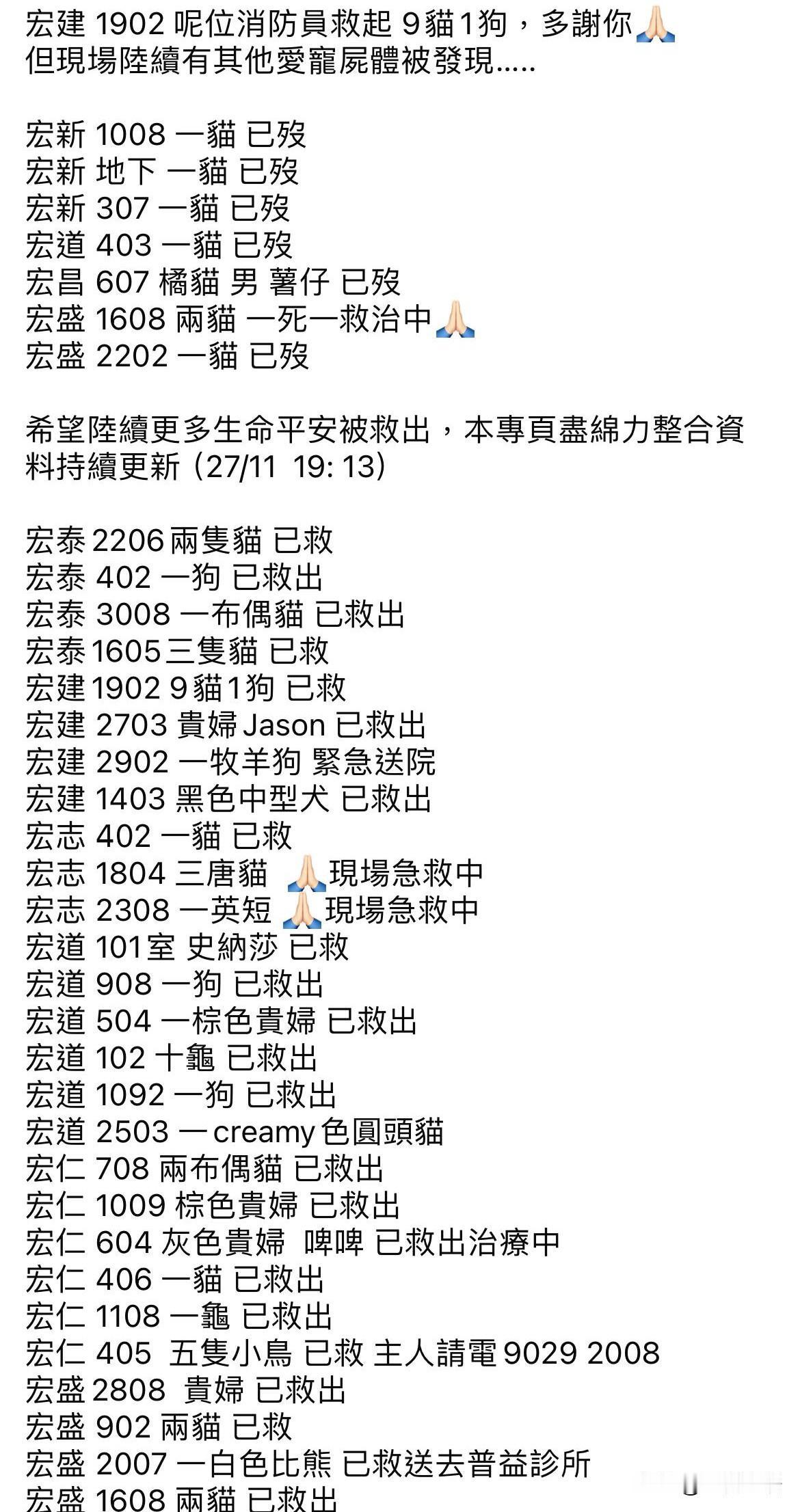 香港宏福苑大火看得我心揪疼😭 浓烟裹着烈焰 消防员一趟又一趟冲进火场 不光救人 更没丢下那些毛孩子! 9只猫1只狗、布偶、比熊、牧羊狗 还有乌龟、小鸟…… 每一只都被他们小心翼翼护出来 哪怕冒着危险,也不放弃一条生命❤️ 评论区全是心疼和致敬 有人说这是最暖的救援 也有人揪心没找到的毛孩 一张长长的获救名单 是消防员用勇气拼出来的希望 他们不是超人 却为生命逆行 向消防员致敬! 向消防局致敬! 愿剩下的毛孩都能平安 愿每一份牵挂都能团圆! 香港夺命大火 消防员