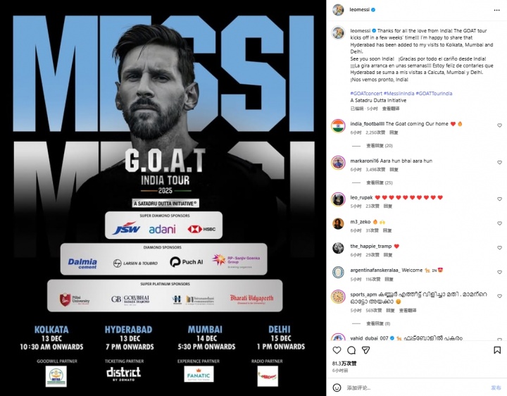 直播吧11月28日讯梅西更新社媒,宣布12月印度行新增一站海得拉巴。