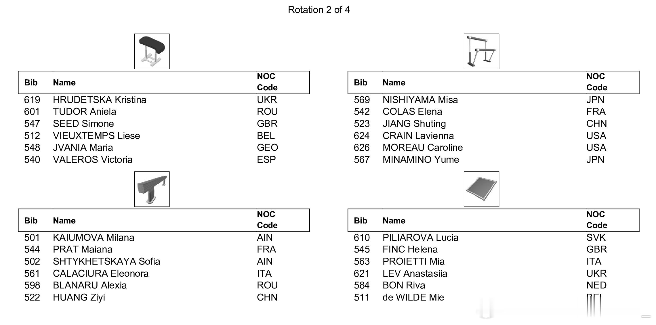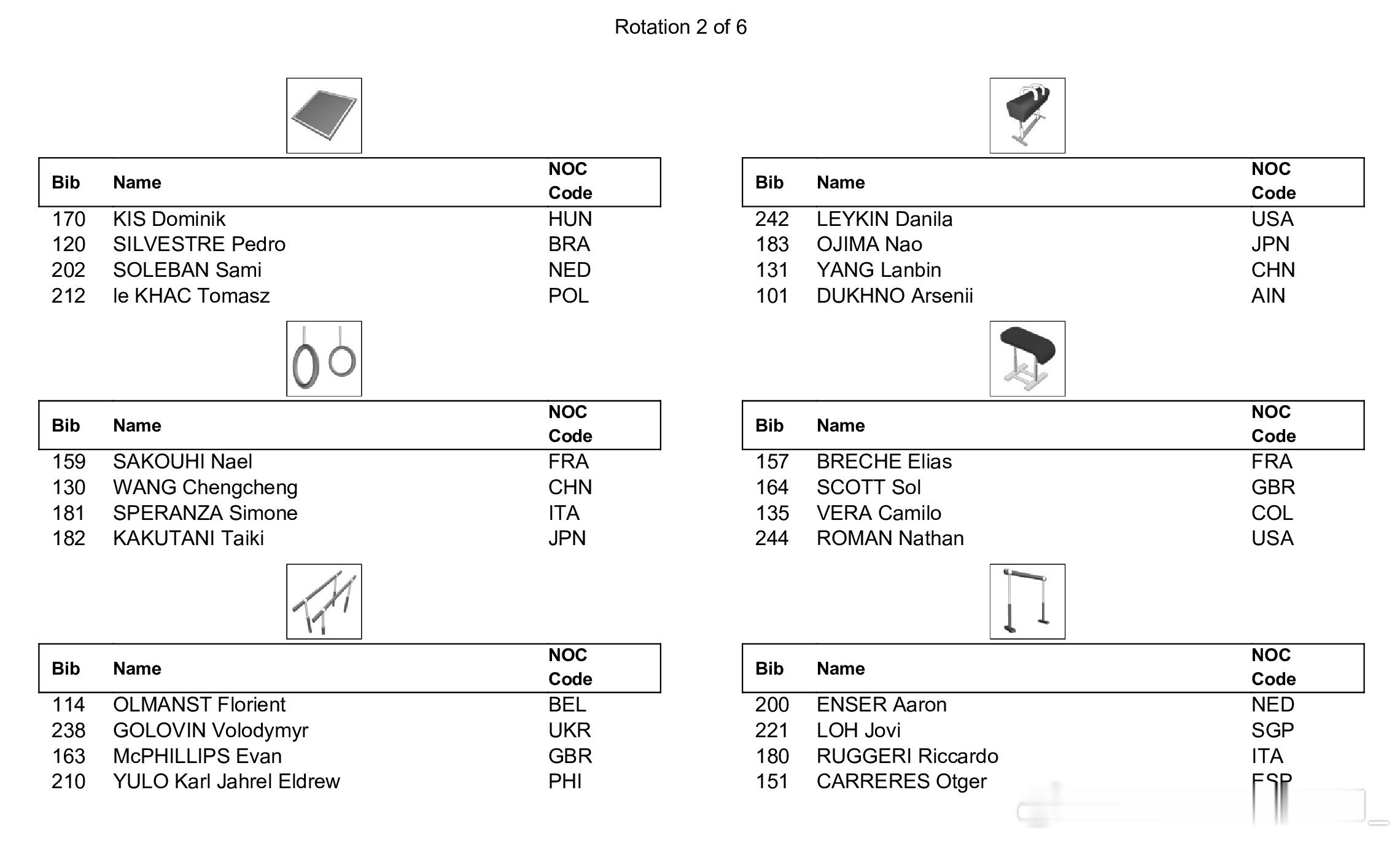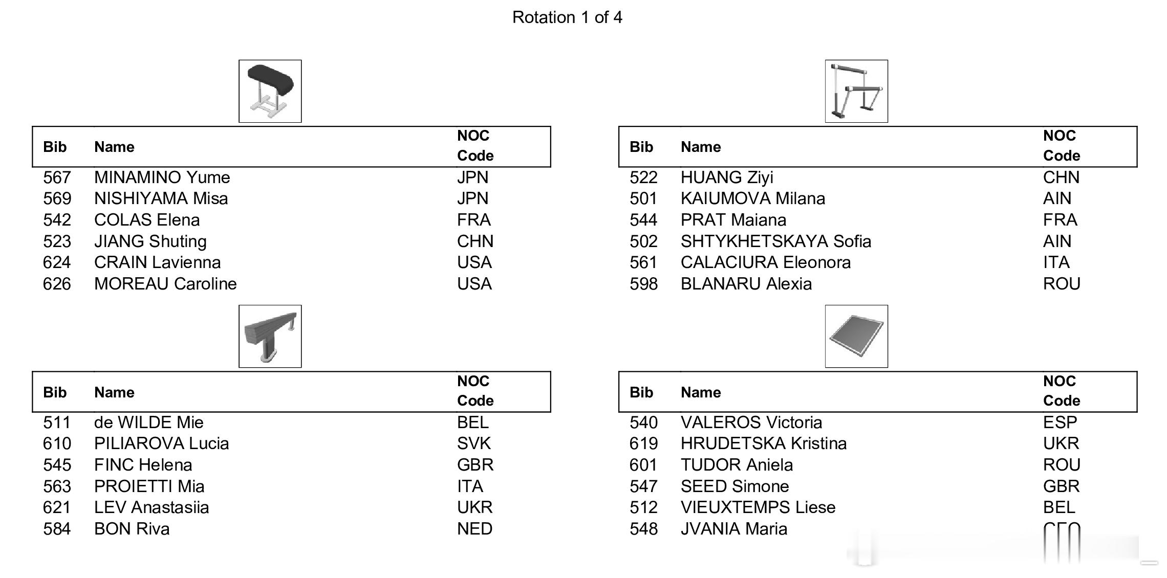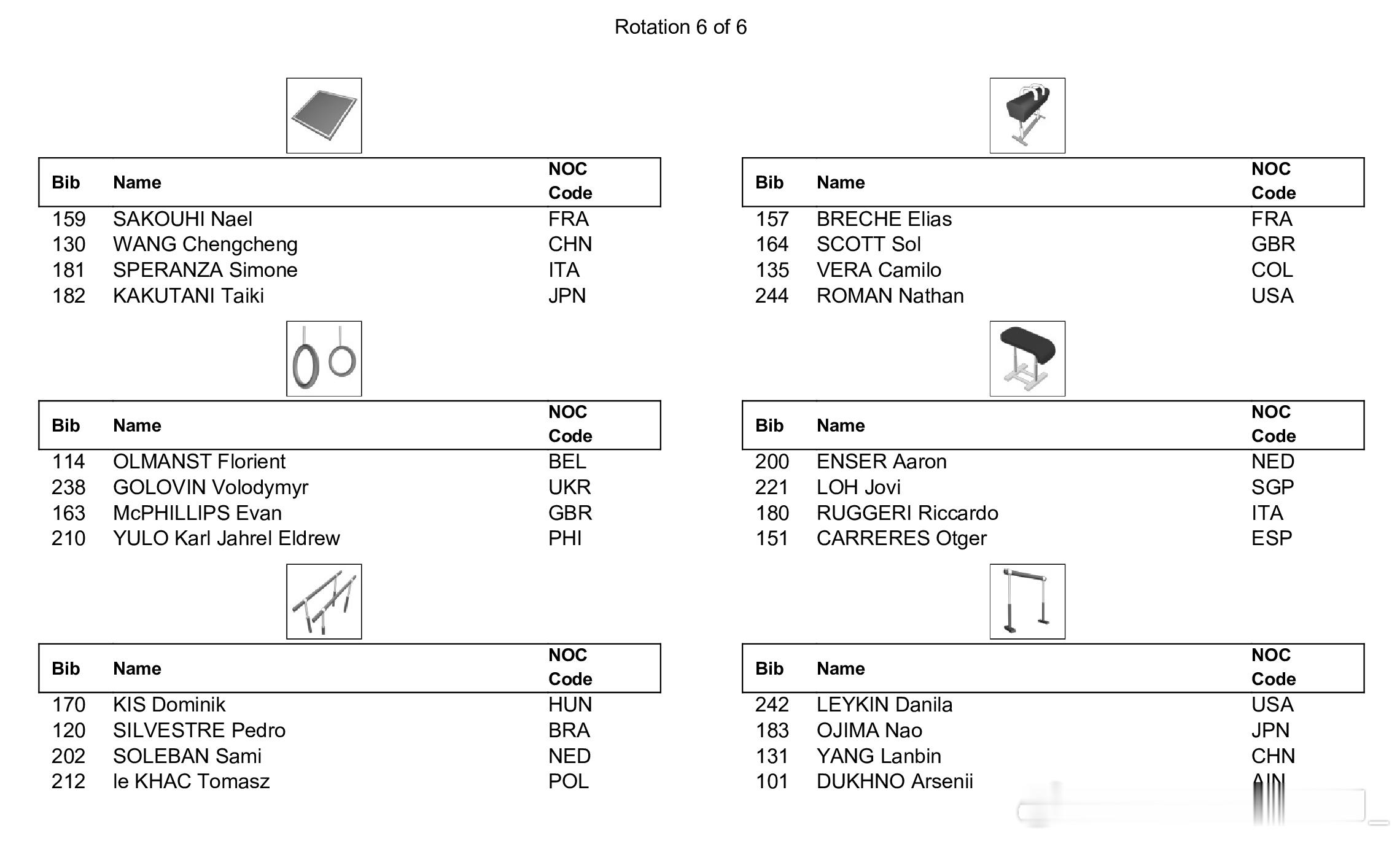 世青赛全能决赛将于今天进行,下午15:00将首先进行男子全能决赛,同样采取六项同时进行、每组四人轮换的新规,中国选手杨兰斌将在第一组登场,从自由操开始,同组的还有以中立身份参赛的俄罗斯选手Arsenii Dukhno,日本选手小島埜和,以及美国选手Danila Leykin。另一位中国选手王呈丞将在第二组登场,从鞍马开始。晚上19:00将进行女子全能决赛,中国选手蒋淑婷进入第一组,同组的还有法国选手Elena Colas,日本选手西山実沙和南埜佑芽,以及美国选手Caroline Moreau和Lavienna Crain。另一位中国选手黄紫艺将在第二组亮相,从高低杠开始。具体出场顺序如图。