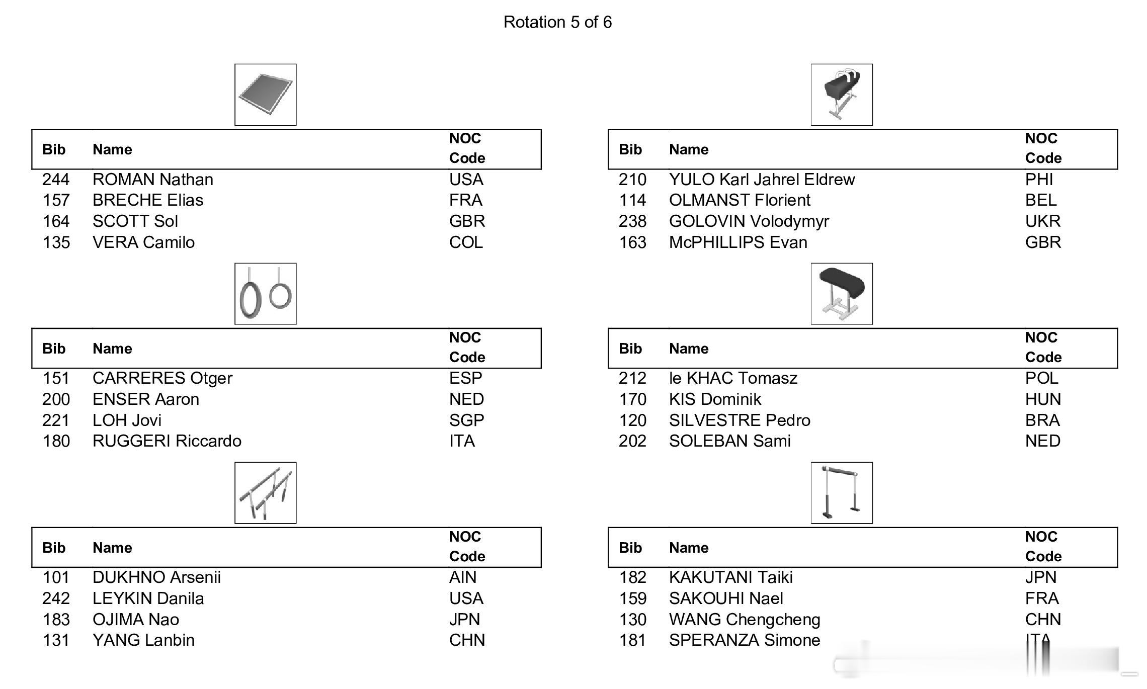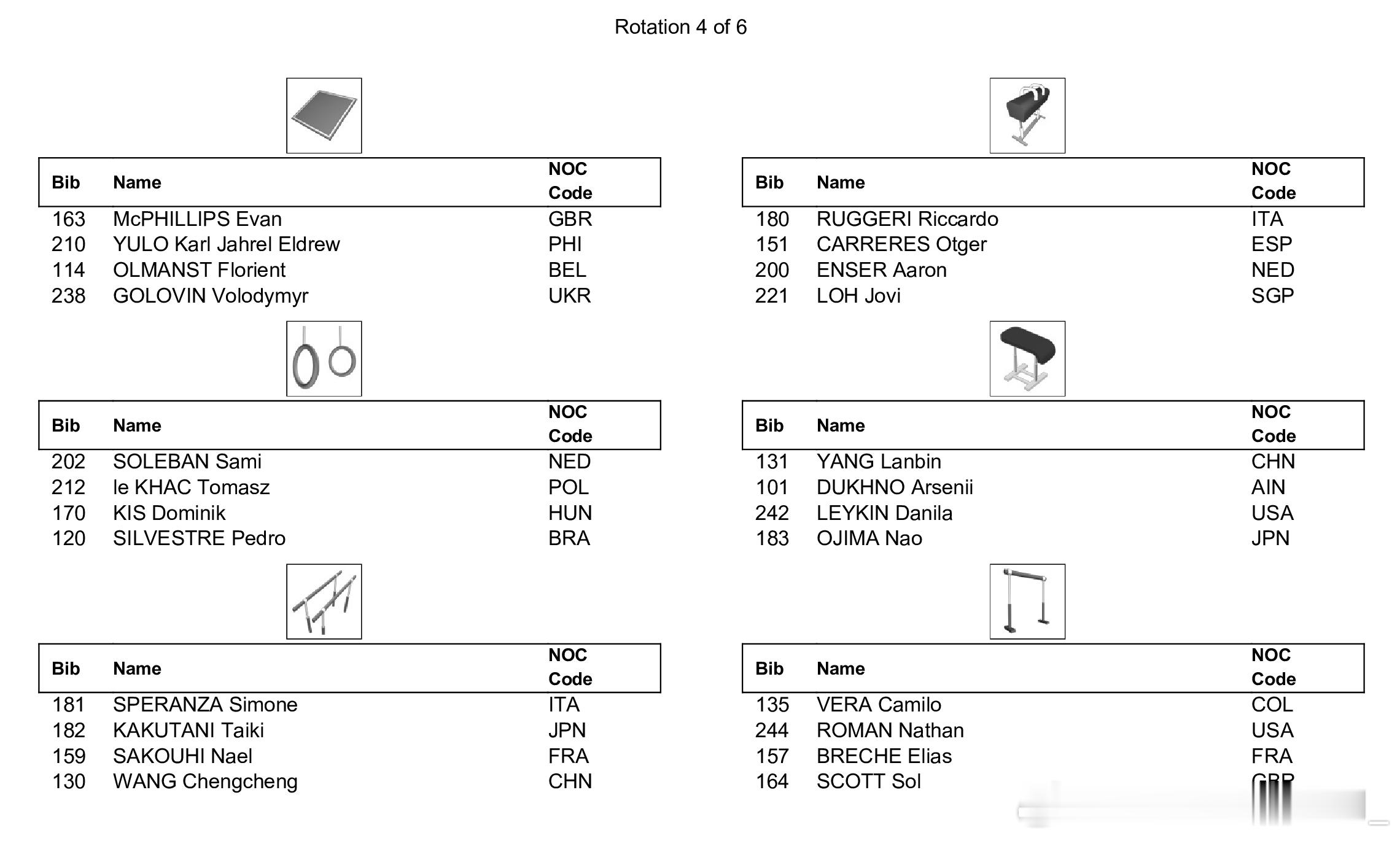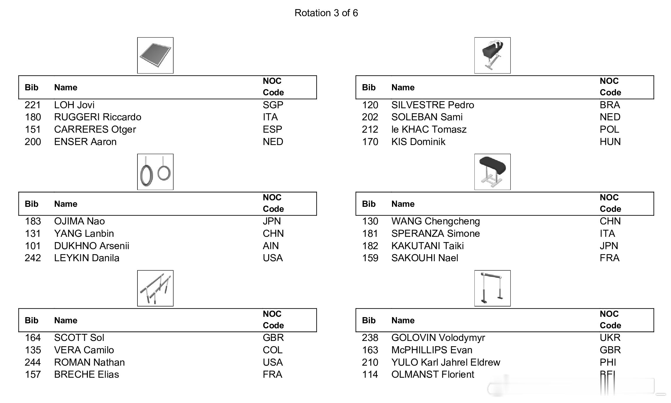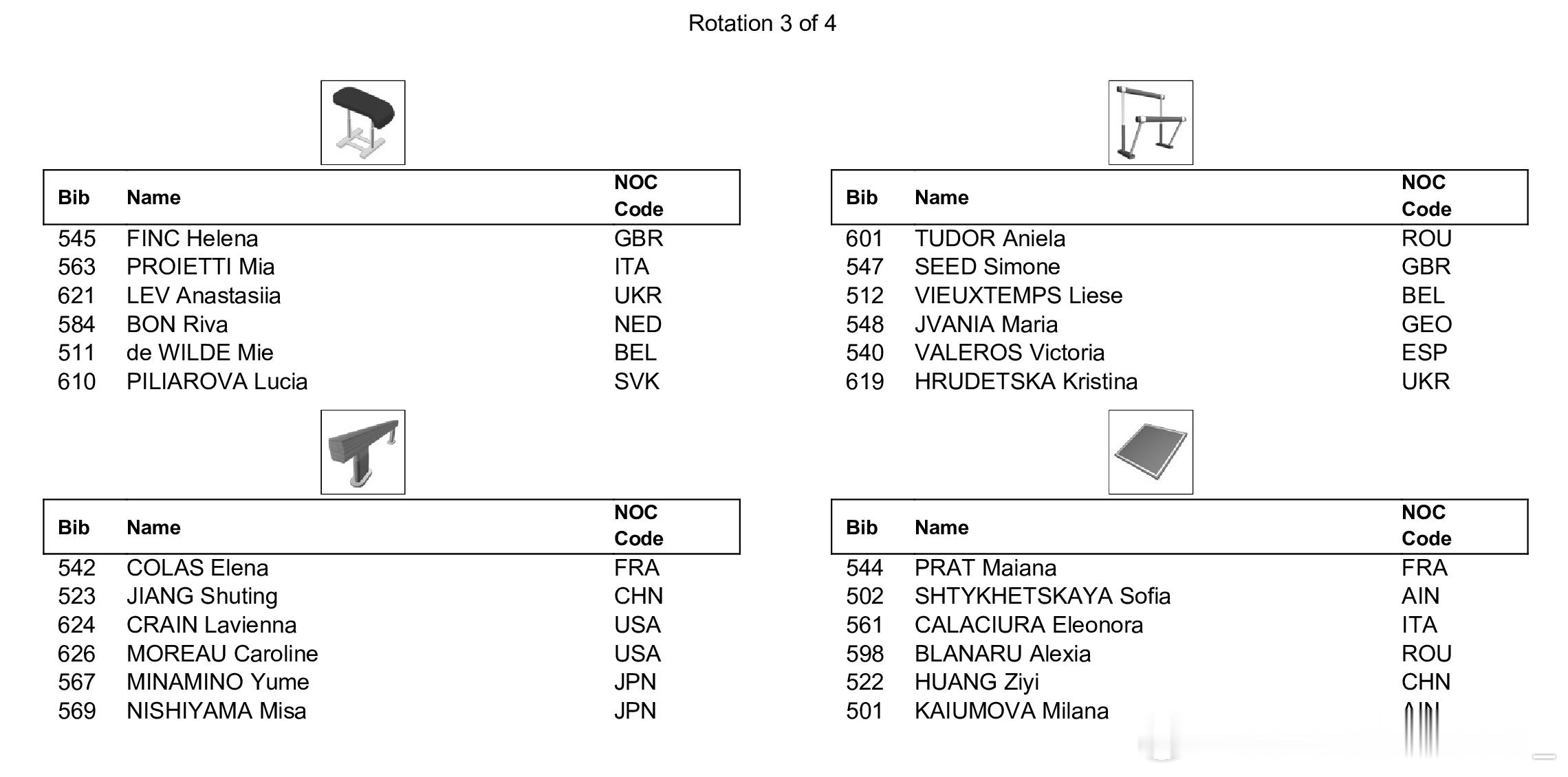 世青赛全能决赛将于今天进行,下午15:00将首先进行男子全能决赛,同样采取六项同时进行、每组四人轮换的新规,中国选手杨兰斌将在第一组登场,从自由操开始,同组的还有以中立身份参赛的俄罗斯选手Arsenii Dukhno,日本选手小島埜和,以及美国选手Danila Leykin。另一位中国选手王呈丞将在第二组登场,从鞍马开始。晚上19:00将进行女子全能决赛,中国选手蒋淑婷进入第一组,同组的还有法国选手Elena Colas,日本选手西山実沙和南埜佑芽,以及美国选手Caroline Moreau和Lavienna Crain。另一位中国选手黄紫艺将在第二组亮相,从高低杠开始。具体出场顺序如图。