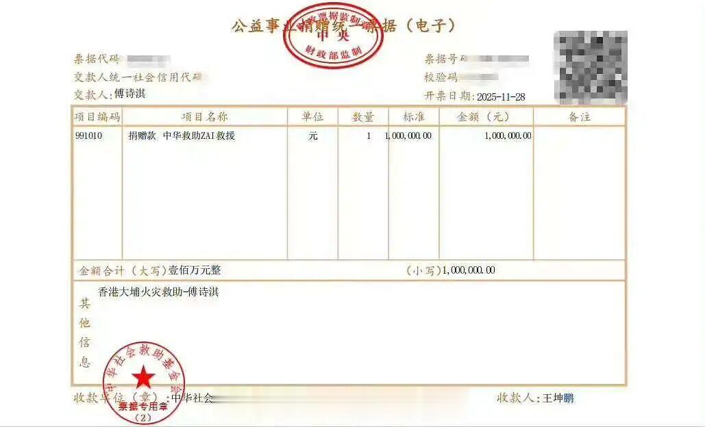 11月28日晚,中华社会救助基金会官方发文确认,@成毅通过该机构捐赠100万元人民币,款项专项用于香港大埔火灾受灾同胞的生活安置与后续帮扶。
