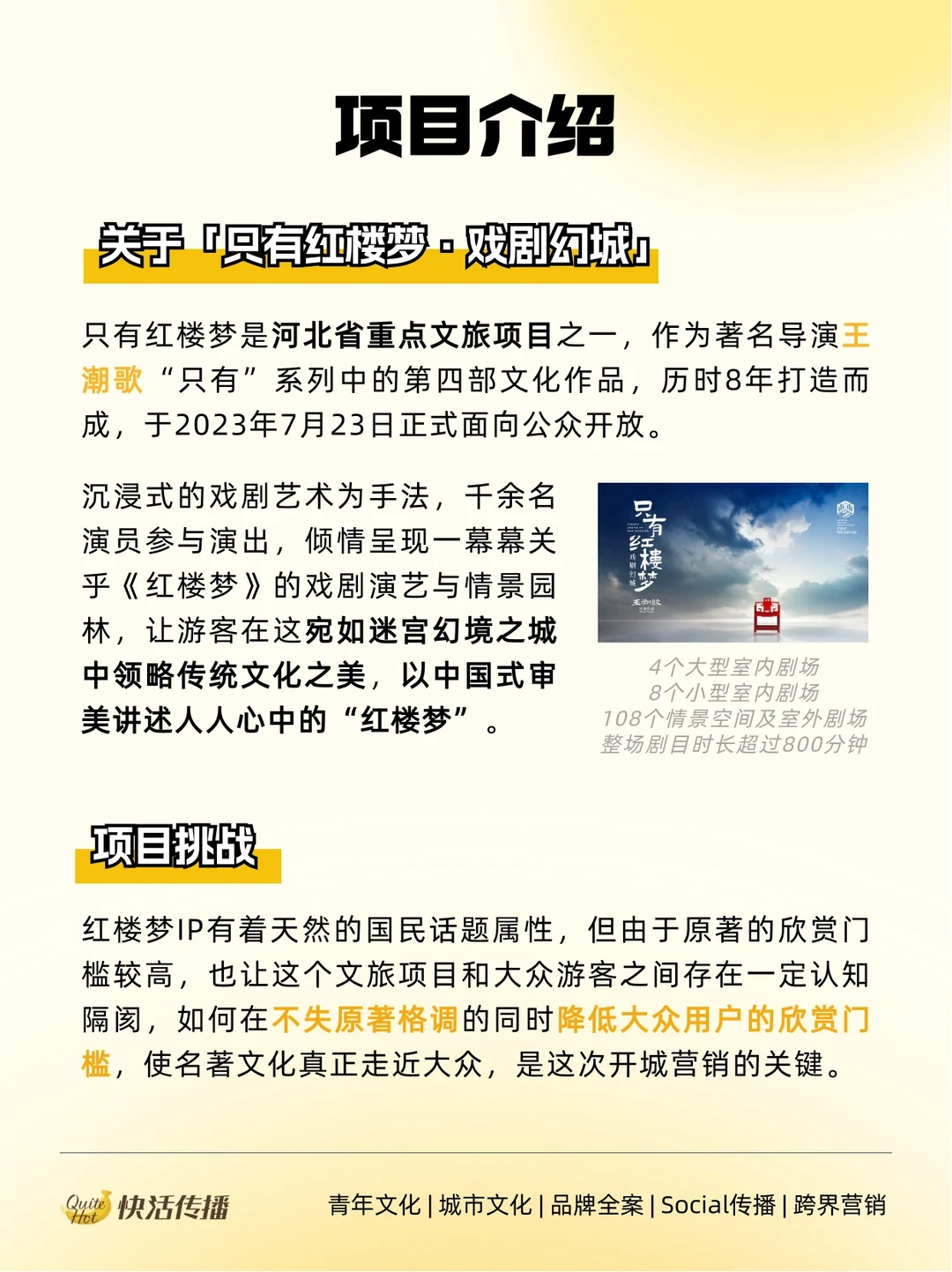 [火R]作为导演王潮歌继「只有河南」之后的又一力作,为期3个月的开城营销中,「只有红楼梦」通过名著IP的文化感营销,让“红学”绑定年轻人的社交圈,实现了流量破圈。