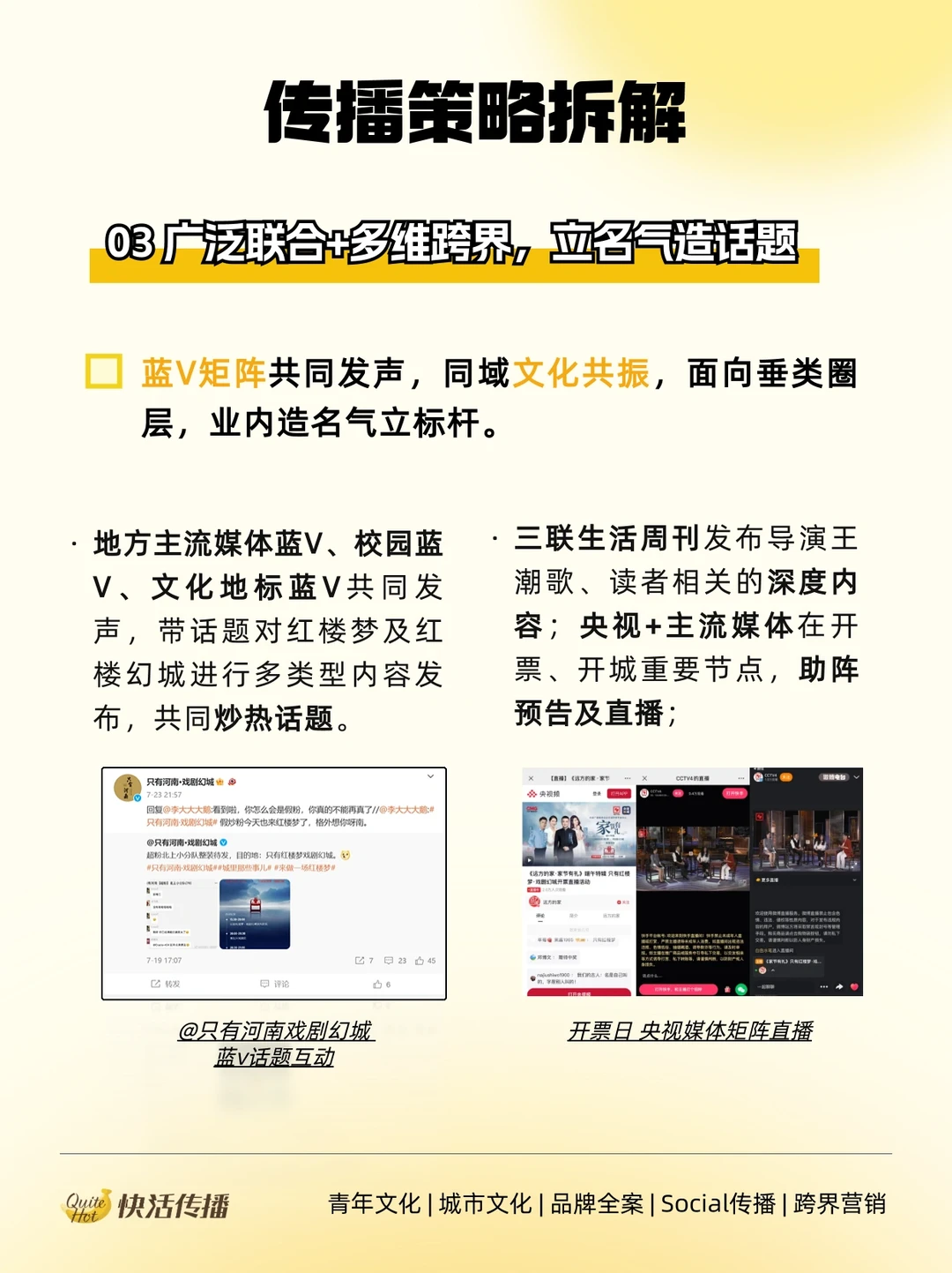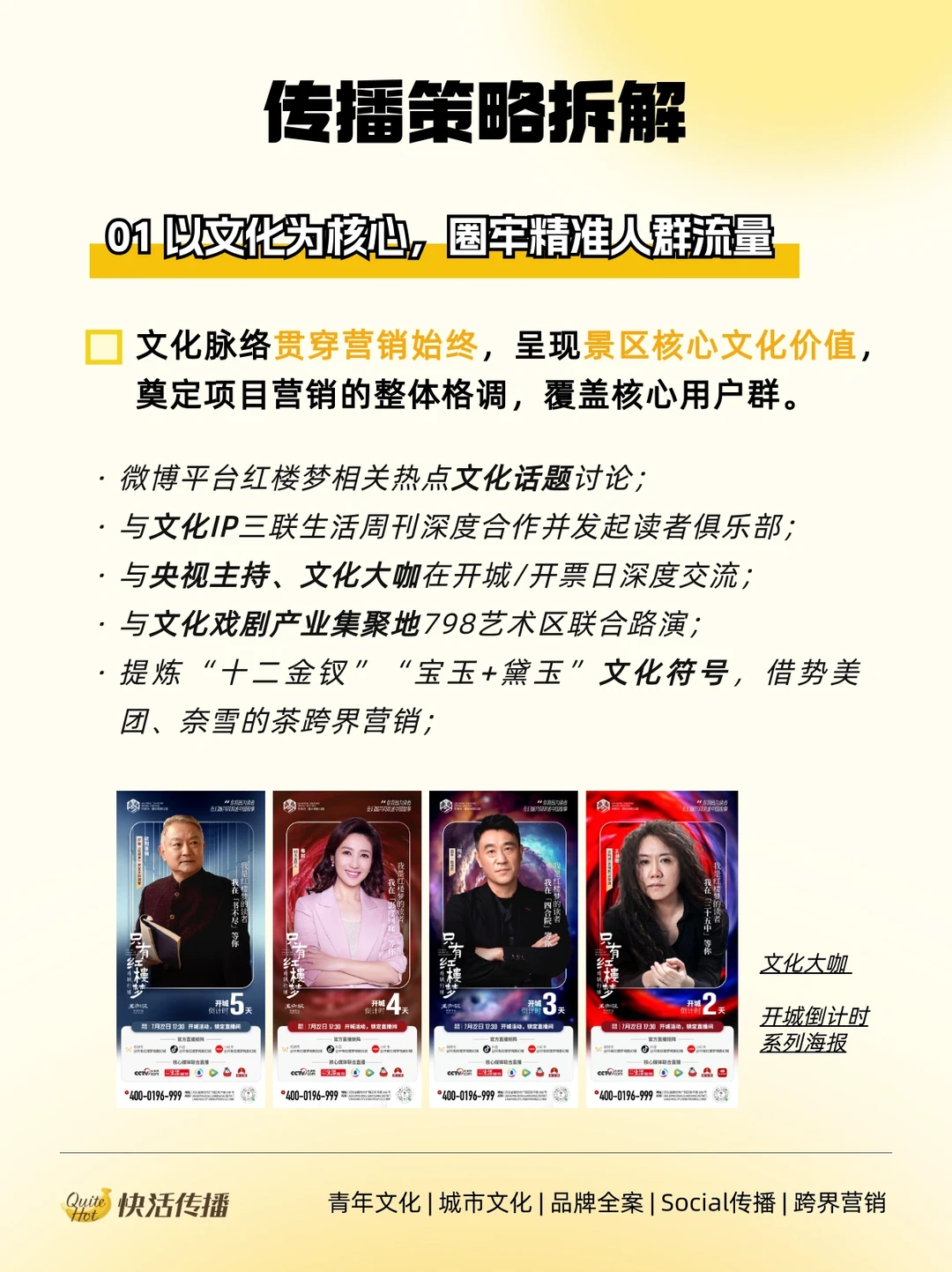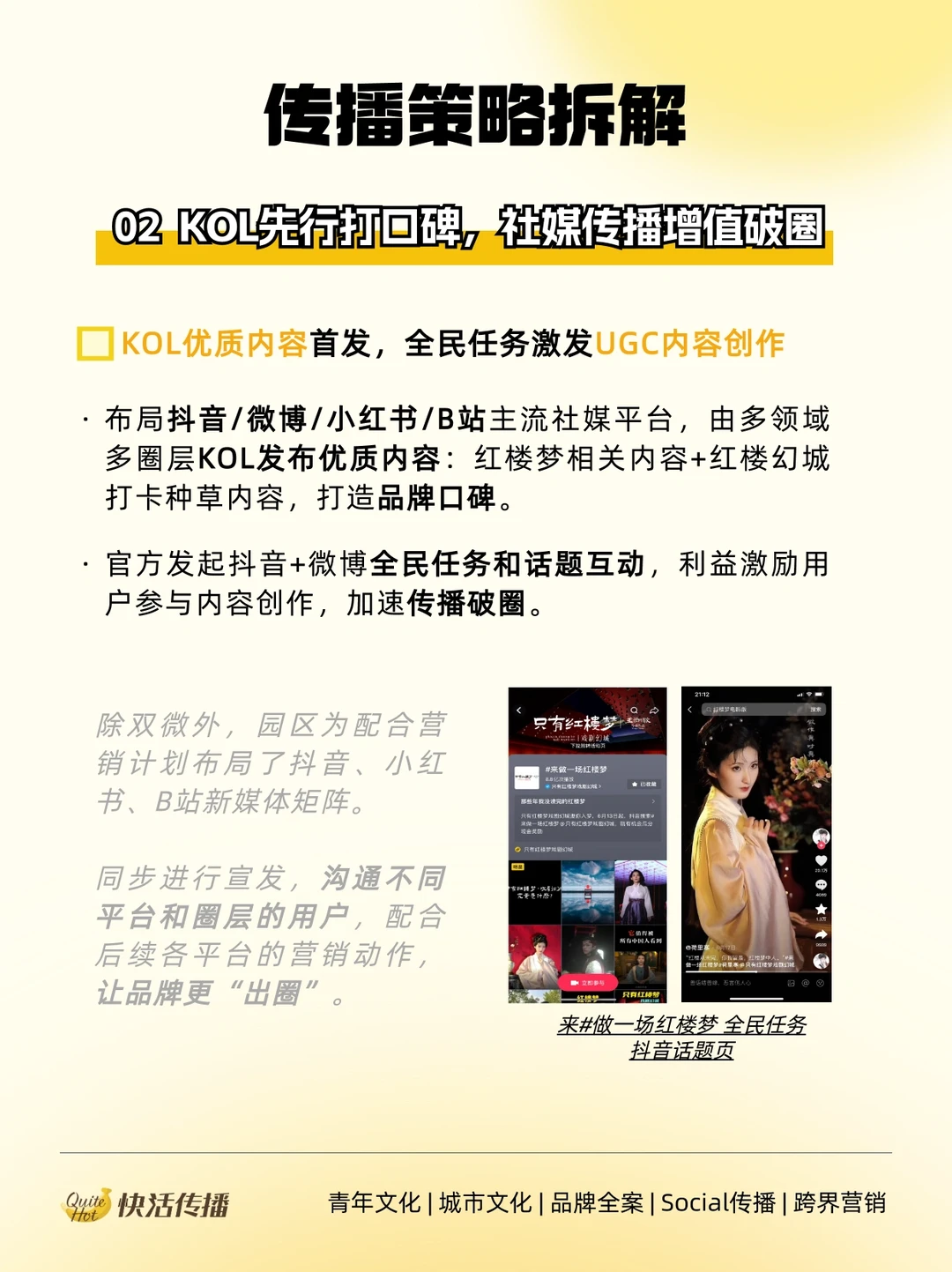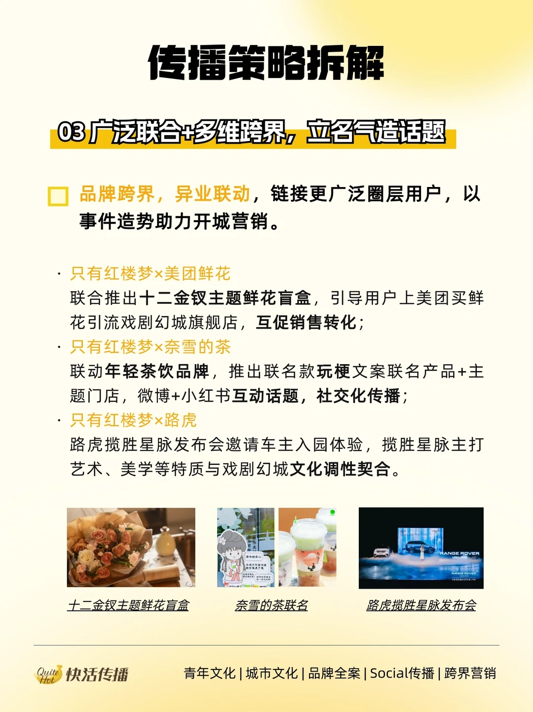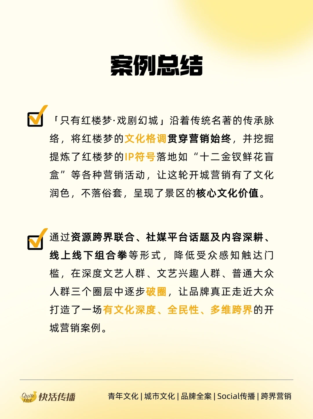 「只有红楼梦·戏剧幻城」沿着传统名著文化的传承脉络,将红楼梦的文化格调贯穿营销始终,通过资源跨界联合、社媒平台话题及内容深耕、线上线下组合拳等形式,实现人群破圈,打造了一场有文化深度、全民性、多维跨界的开城营销案例。