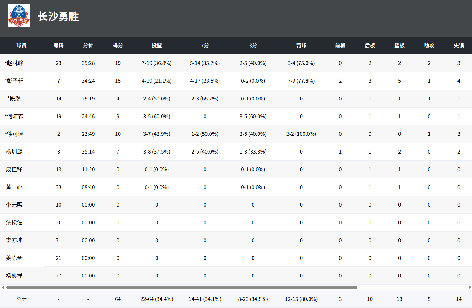 长沙勇胜:赵林峰19分、彭子轩15分、徐可涵10分