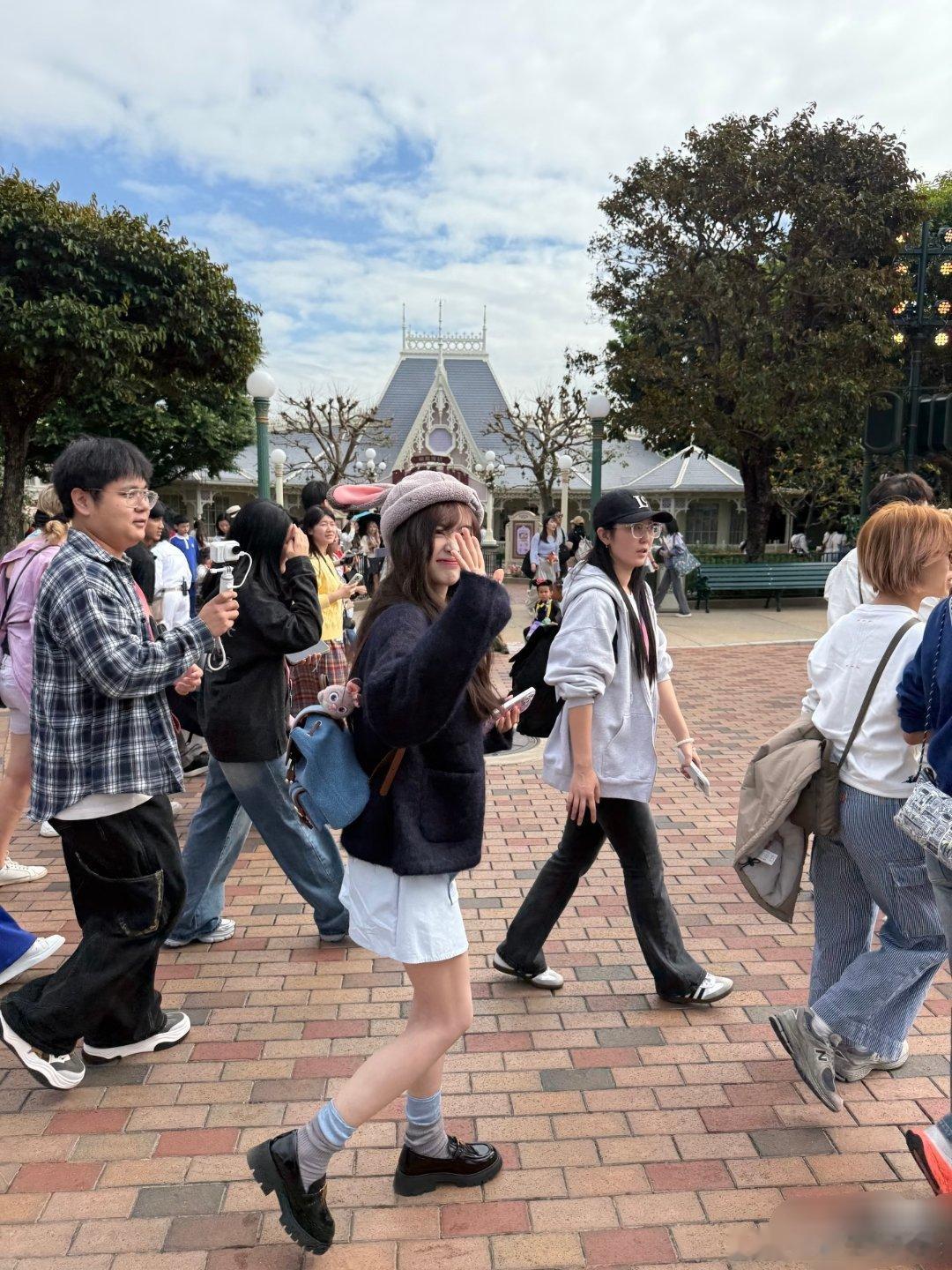 港迪偶遇了吴宣仪捏,,戴着兔子帽子,还在和路人打招呼