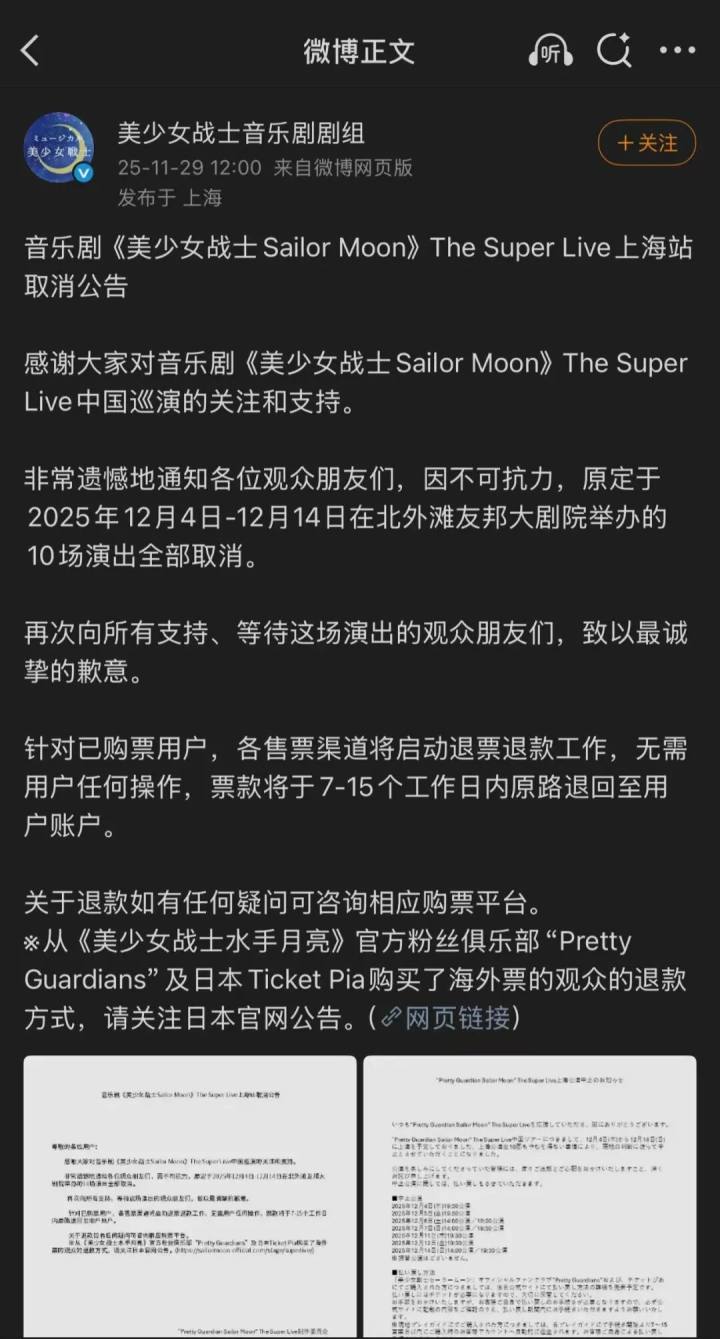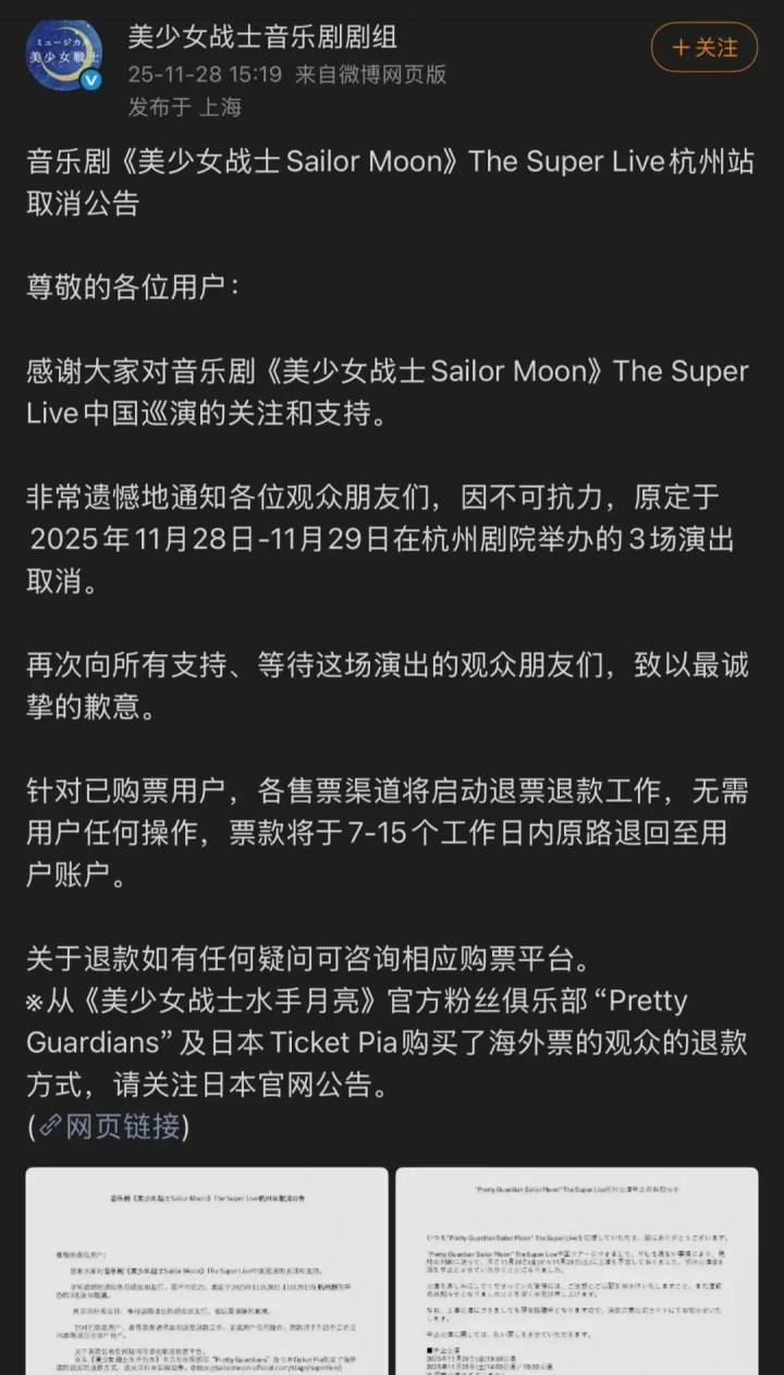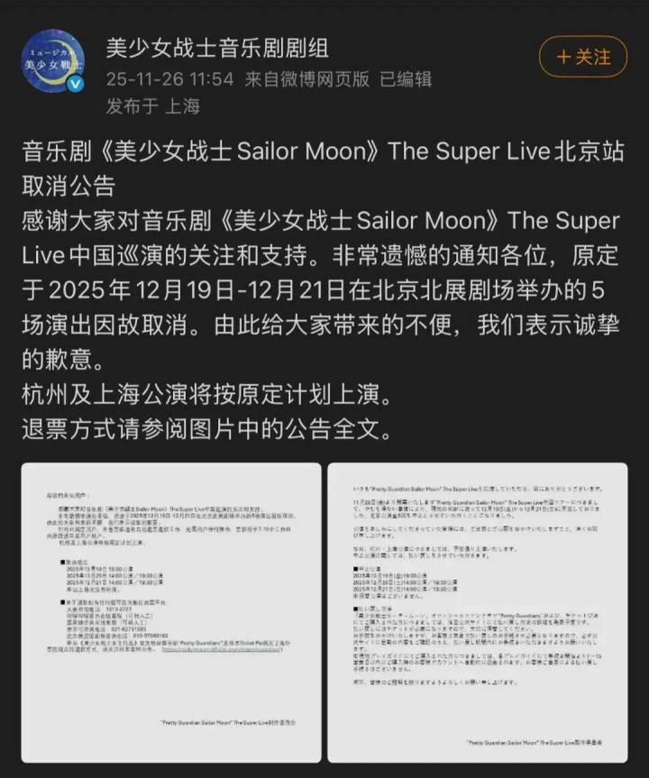 据美少女战士音乐剧剧组官方微博消息,原定在北京、上海、杭州举行的日本人气动画《美少女战士》音乐剧演出取消。