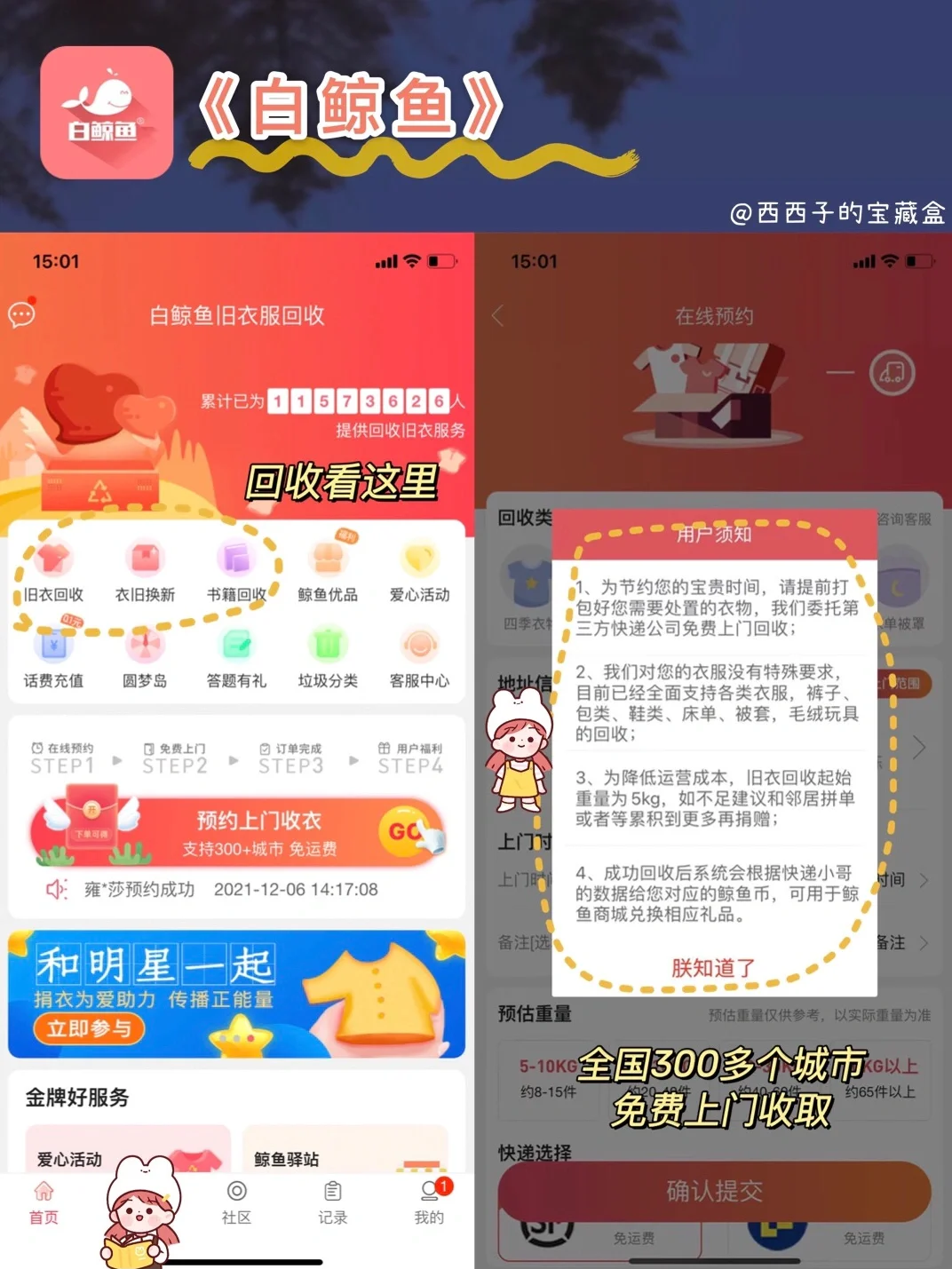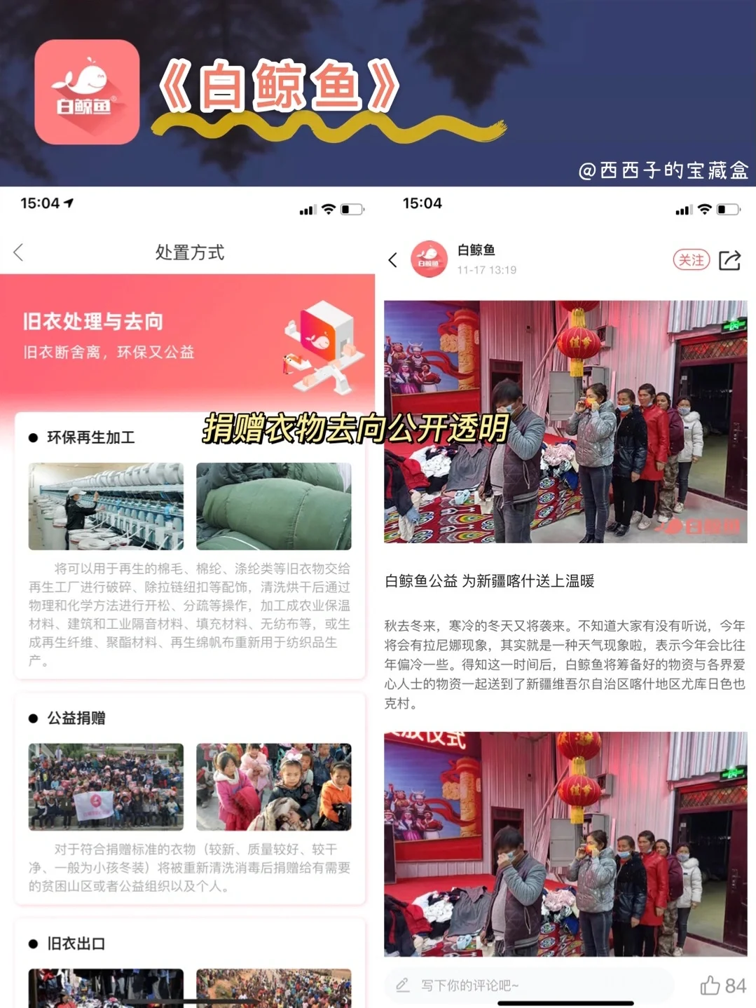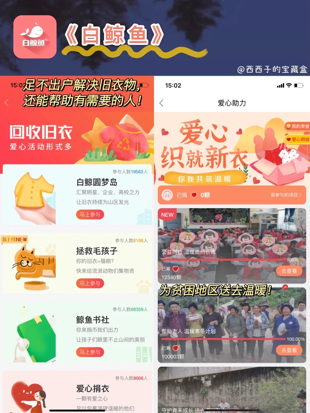 平台会根据回收的重量回馈你🐳鲸鱼Bi,这个东西可以用去换新的生活物品,而我们的旧衣物会经过白鲸鱼精细的分拣、消毒,❤️把符合捐赠标准和需求的衣物捐赠给贫困地区,🌞为他们送去温暖的问候;