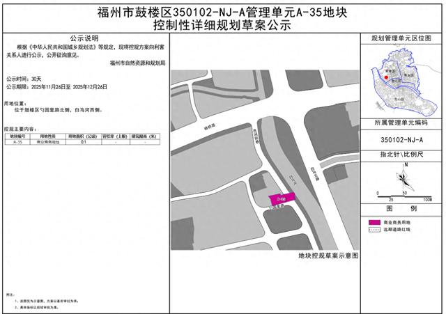 近日,福州市自然资源和规划局发布一幅地块控制性详细规划草案,该地块位于鼓楼区南街片区,南至勺园里路,东邻白马河。该控规草案经研究审议,根据《中华人民共和国城乡规划法》等相关规定,现广泛征求社会各界意见,公示时间为2025年11月26日至2025年12月26日。
