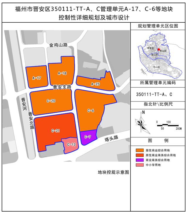 此外,福州市晋安区350111-TT-A、C管理单元A-17、C-6等地块控制性详细规划及城市设计已经法定程序获得福州市人民政府批复,根据《中华人民共和国城乡规划法》等有关规定,现将经市政府批准的规划予以公布。用地性质分别为居住商业综合用地、居住商业商务综合用地、商业商务综合用地、中小学用地。