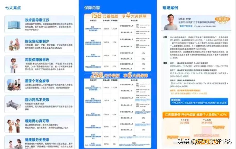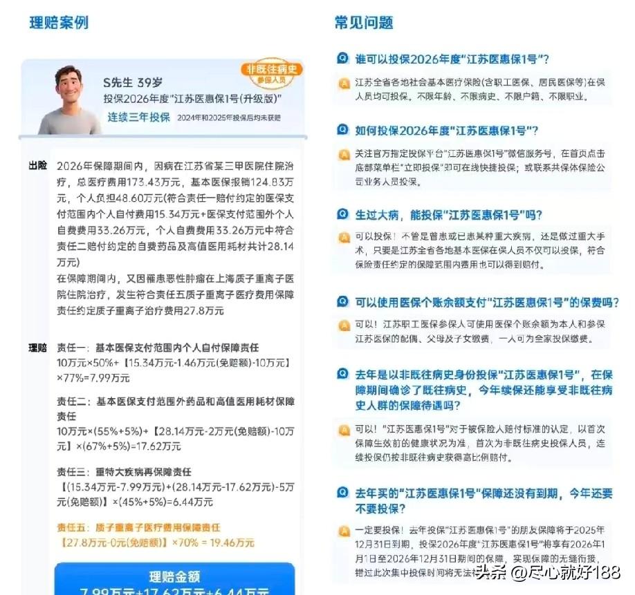 生活水平提高了,追求的东西就丰富多彩起来,幸运的欣赏到更多精彩的瞬间,比如今年的苏超,就让地球人都开心的看到比中超联赛还火爆的球赛,江苏人的健康“新护盾”:2026江苏医惠保1号来啦,简直比苏超还火爆,还更深入人心,获得掌声更多! 2026年度江苏医惠保1号,在2025年9月23日已经正式上线,简直是江苏人欢天喜地的一大福利,让越来越多的家庭成员享受到健康快乐的陪伴。 江苏医惠保1号是有政府撑腰的,在江苏省医疗保障局、国家金融监督管理总局江苏监管局的指导监督下推出,与基本医保紧密衔接,就像给咱的健康上了双保险,安全感满满,让每个想要健康快乐的人,都能有机会,去积极参与,得到全方位的健康呵护,简直比看球赛还过瘾,还能获得更多响亮的掌声。 这次升级的亮点简直是丰富多彩,特别是投保条件那叫一个宽松,不管你年龄多大、有没有病史、户籍在哪、从事啥职业,只要是省内各地基本医疗保险在保状态,都能投保,还支持直系亲属互相购买,真的太人性化了,让每个角落都有阳光的照顾,让每个有需要健康快乐的家庭,都能得到充实的保障机会。 医保个账全家享这个功能也太实用了,江苏职工医保参保人能用医保个账余额为本人和参保江苏医保的配偶、父母及子女投保,不用额外掏现金,全家投保轻松又放心,住院期间,院内购买使用的药品费用不受基本医保目录限制,这意味着能用上更多对症的好药,只要有健康的机会,就给与最大的全方位的支持,一定让健康的动力驰骋起来不停歇。 江苏医惠保1号的理赔是绝对相当靠谱,线上理赔简便快捷,线下网点服务贴心,响应时间快、赔付效率高,累计赔付金额超27亿元,真真切切地帮到了大家,让快速的理赔,把温暖阳光及时送给每一个健康的家庭去,让大家欢声笑语多起来。 还新增了滴滴打车福利券、视频周卡等11项生活权益,从投保期到保障期都有持续的健康服务守护,用丰富多彩的前期准备,让健康呵护逐步落实到位,让大家都有健康呵护的陪伴的好机会。 保障区域覆盖江苏全省,参保时间是2025年9月23日至12月31日,保障时间从2026年1月1日至12月31日,让大家有时间去辨别去了解,有充分的认识,有稳稳的加入,才有放心健康的2026年,让家庭更有保障,家人更安心,让所有家人一起手拉手,都健健康康的渡过活力满满的2026年!