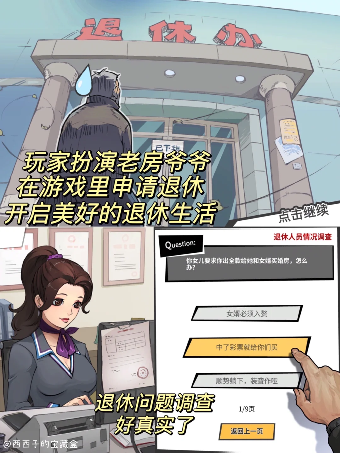 👴我们玩家需要在游戏里扮演可爱有趣的老房爷爷,以老房的视角去规划自己的退休生活,🤔你可以选择上网冲浪,追剧看综艺,💃跳广场舞逛公园这类养老型的娱乐生活。也可以选择旅游全世界,🎨培养自己的艺术爱好,继续搬砖打工的奋斗型生活!