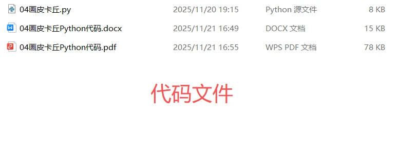 可以发文件了 自从可以发文件之后,后面的笔记基本上都会给你们附带文件,今天分享的是用海龟绘图画的皮卡丘,而且是眼睛会动的皮卡丘,图[一R]和图[二R]就是眼睛睁开和闭上的效果。 图[三R]是我准备的皮卡丘的代码文件,有py文件,word版文件和pdf文件,本文附带pdf文件,但是不可以复制,可以复制的是word文件和py文件。 ~