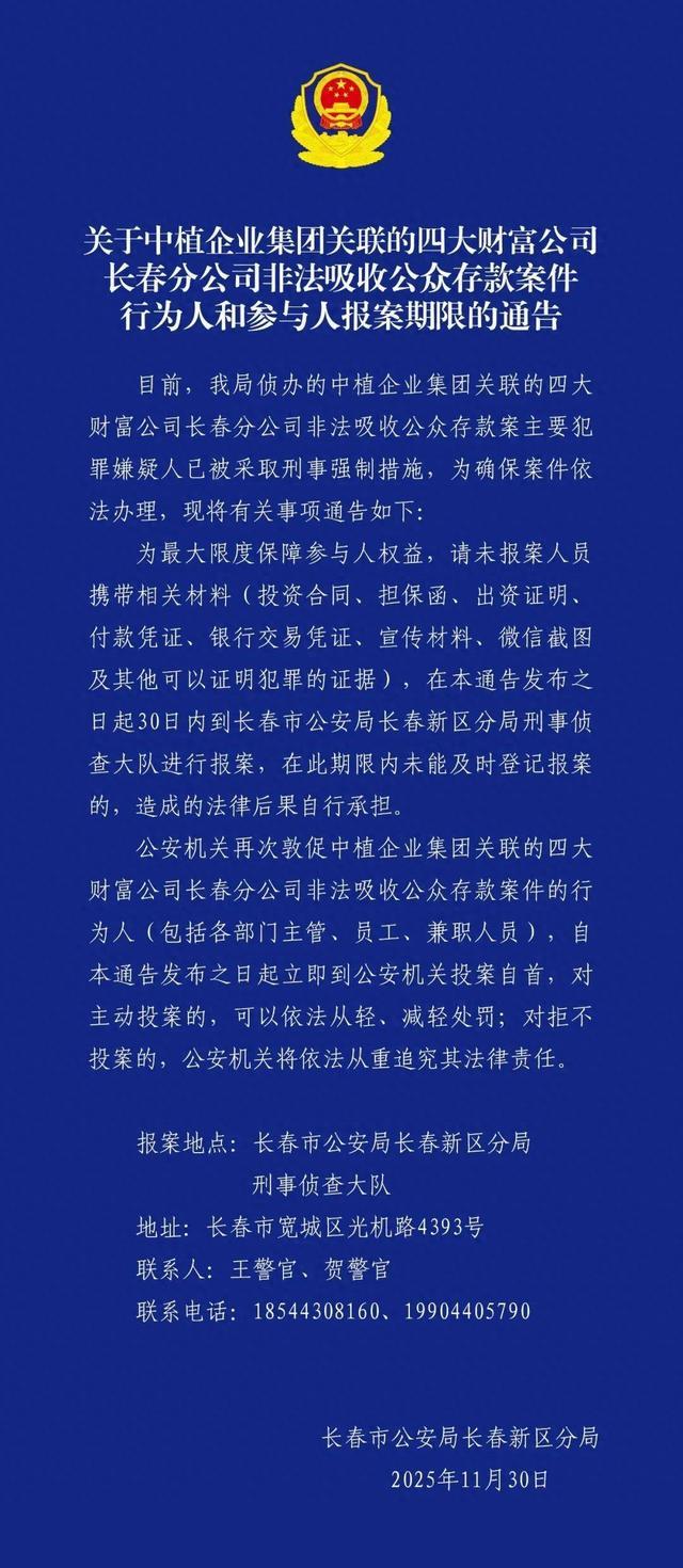 11月30日,长春新区公安发布《关于中植企业集团关联的四大财富公司长春分公司非法吸收公众存款案件行为人和参与人报案期限的通告》——
