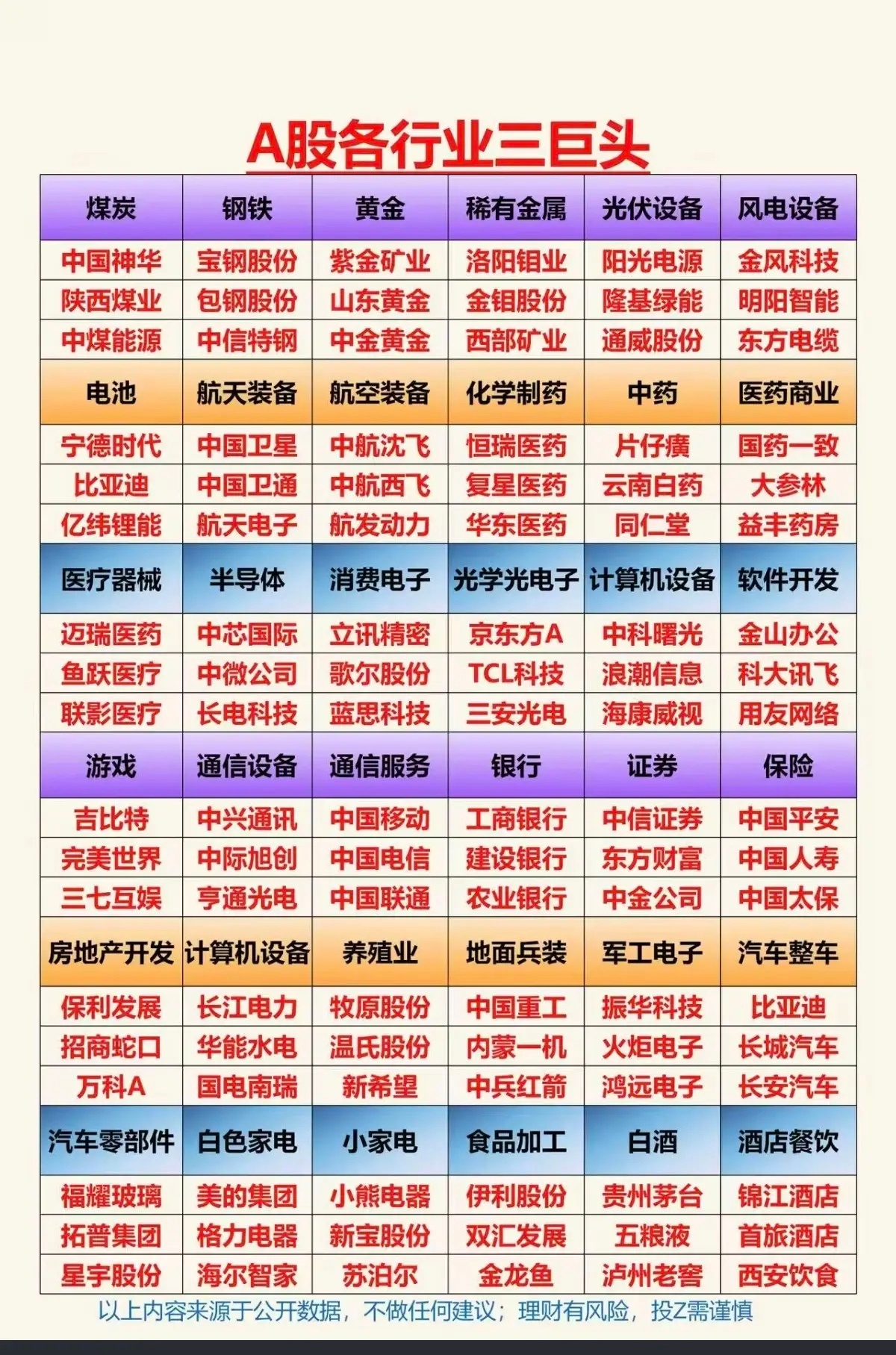 A股各细分行业:垄断三巨头!各细分行业,市场垄断性龙头,前3名!买股票,就要买龙头,强者恒强!