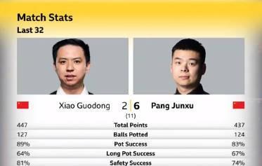 2025英锦赛,首位种子选手出局,肖国栋2-6不敌队友庞俊旭! 英锦赛正赛首轮第二个比赛日,继吴宜泽6-4击败马修-赛尔特后,庞俊旭以6-2击败两个排名赛冠军世界排名TOP16的种子选手肖国栋,成为八位16强选手的唯一一位非种子选手。 本场比赛,庞俊旭打出单杆66分,肖国栋打出两杆破百101、104分和一杆50+,庞俊旭3-1领先肖国栋进入局间休息,接下来庞俊旭连下三城锁定胜局,最终6-2战胜肖国栋,晋级16强!收获15000英镑奖金积分。 恭喜,庞俊旭! #英锦赛# #庞俊旭# #肖国栋#